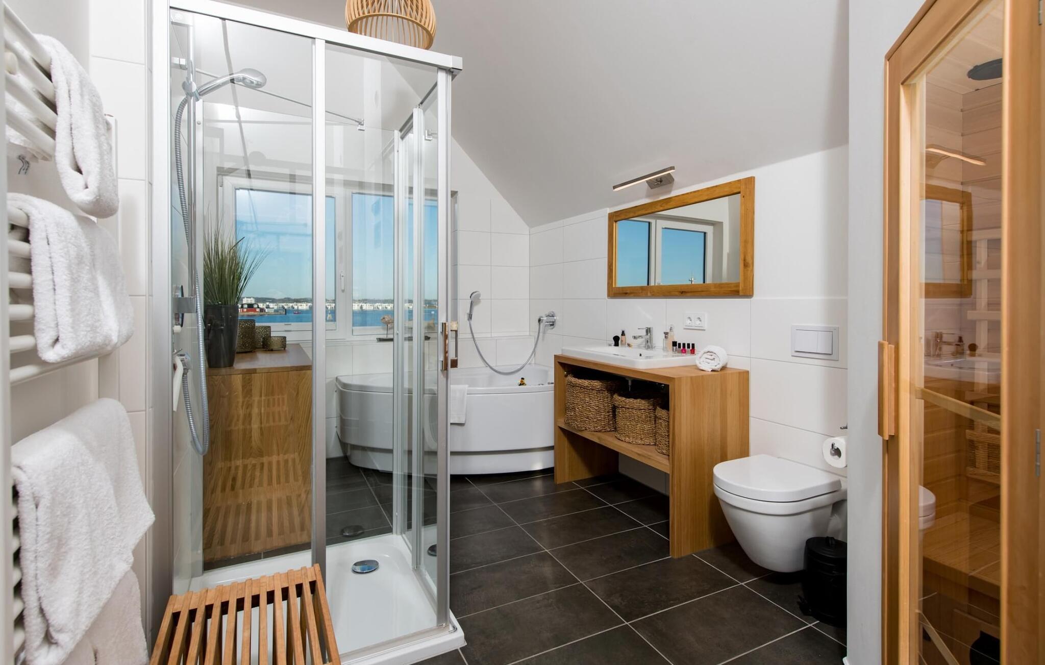 Det private wellnessområde inviterer til afslapning: en infrarød varmekabine med hi-fi lydsystem og LED farvelysterapi samt et stort afslapningsboblebad med udsigt til vandet står til rådighed efter en gåtur på stranden.