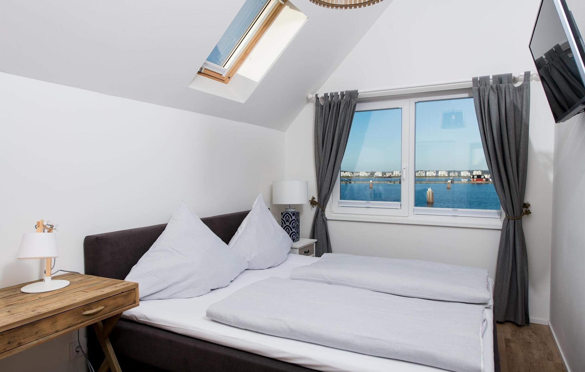 Ferieboligens afslapningsområde er på anden etage. Det store soveværelse har en fantastisk udsigt over havnen. Fald i søvn under stjernerne Et ovenlys giver jer ikke kun mulighed for at se stjernehimlen, men også de drømmeagtige skyformationer, der er så karakteristiske for norden. To ekstra sovepladser er tilgængelige på den komfortable sovesofa i opholdsområdet.