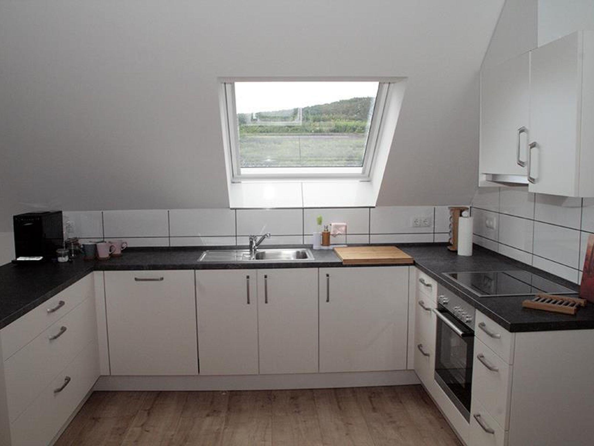 • offene moderne Küche mit Kühlschrank, Spülmaschine, Herd- Backofen, Kaffeeautomat