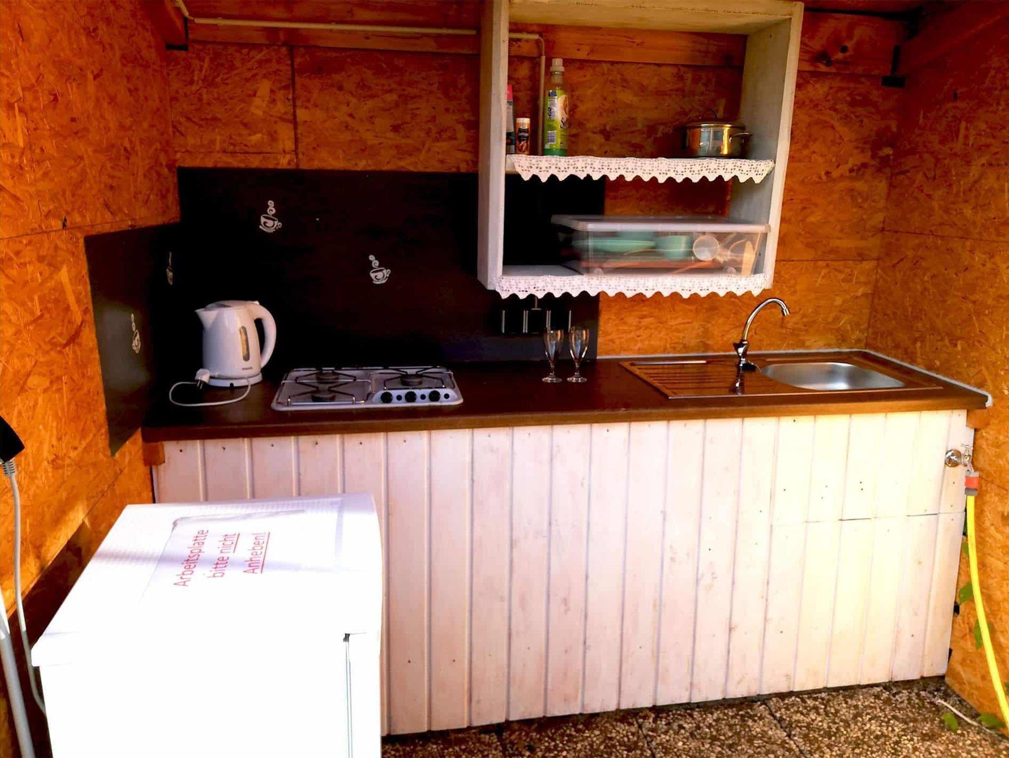 Draußen kannst du unter einem großen Sonnenschirm Platz nehmen, auf den Sitzbänken mit Tisch relaxen. Eine Außenküche mit Kühlschrank, Gasherd, Wasser und Geschirr neben dem Wohnfass kann von dir mitbenutzt werden. Wenn du magst, bring dir gerne einen Pavillon mit. Ein Grill steht ebenfalls zur Verfügung. Dein Wohnfass steht auf der Campingterrasse. Der Preis ist für zwei Personen und inklusive Bettwäsche. Für weitere Personen entstehen zusätzliche Kosten. Für diese zusätzlichen Personen kannst du Bettwäsche mitbringen oder sie bei uns dazubuchen.