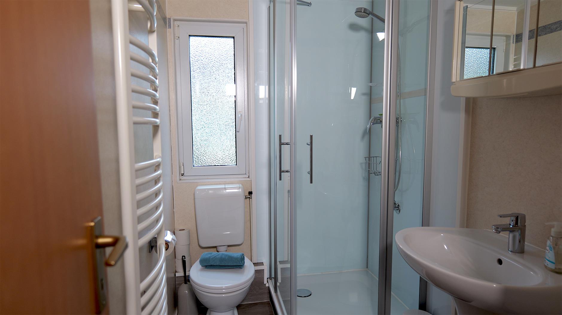 Hier bist du zweckmäßig eingerichtet: In diesen Mobilheimen erwarten dich zwei Schlafzimmer und eine komplett eingerichtete Wohnküche. Geheizt wird bequem über eine Gas-Heiz-Therme. Ein TV ist ebenfalls Teil der Ausstattung. Ein kleines Badezimmer mit WC, Dusche und Handwaschbecken sorgt für eine angenehme Wohlfühlatmosphäre. Auf der Terrasse kannst du gemütlich sitzen und grillen. Dein Fahrzeug parkst du direkt am Objekt. Gerne kannst du deine eigene Bettwäsche und Handtücher mitbringen oder sie bei uns dazubuchen. Die Terrasse verfügt über ein Gatter, mit dem du sie hundefreundlich verschließen kannst.