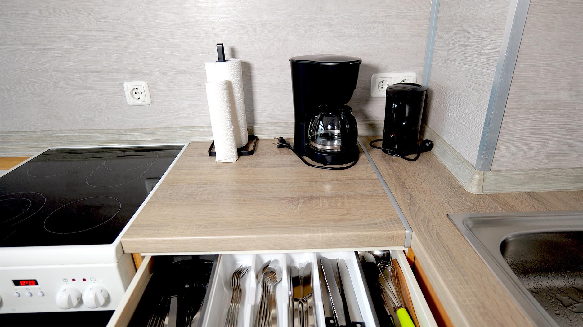 Kleine Wohnung 1008 mit Vollausstattung, separatem Schlafzimmer und der Möglichkeit für die dritte und vierte Person auf der Boxspring-Couch im Wohnzimmer zu schlafen.(#gerneperdu)