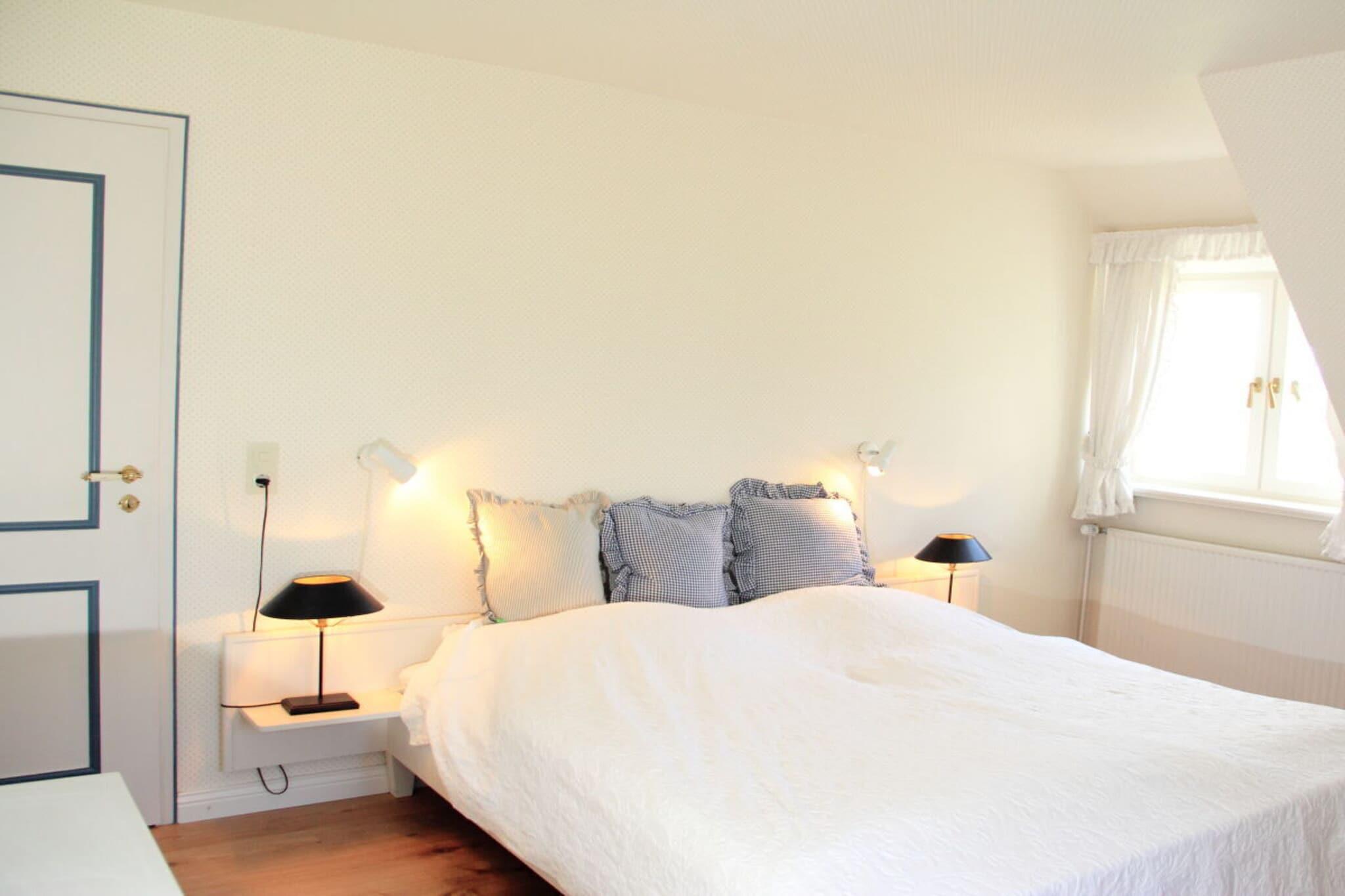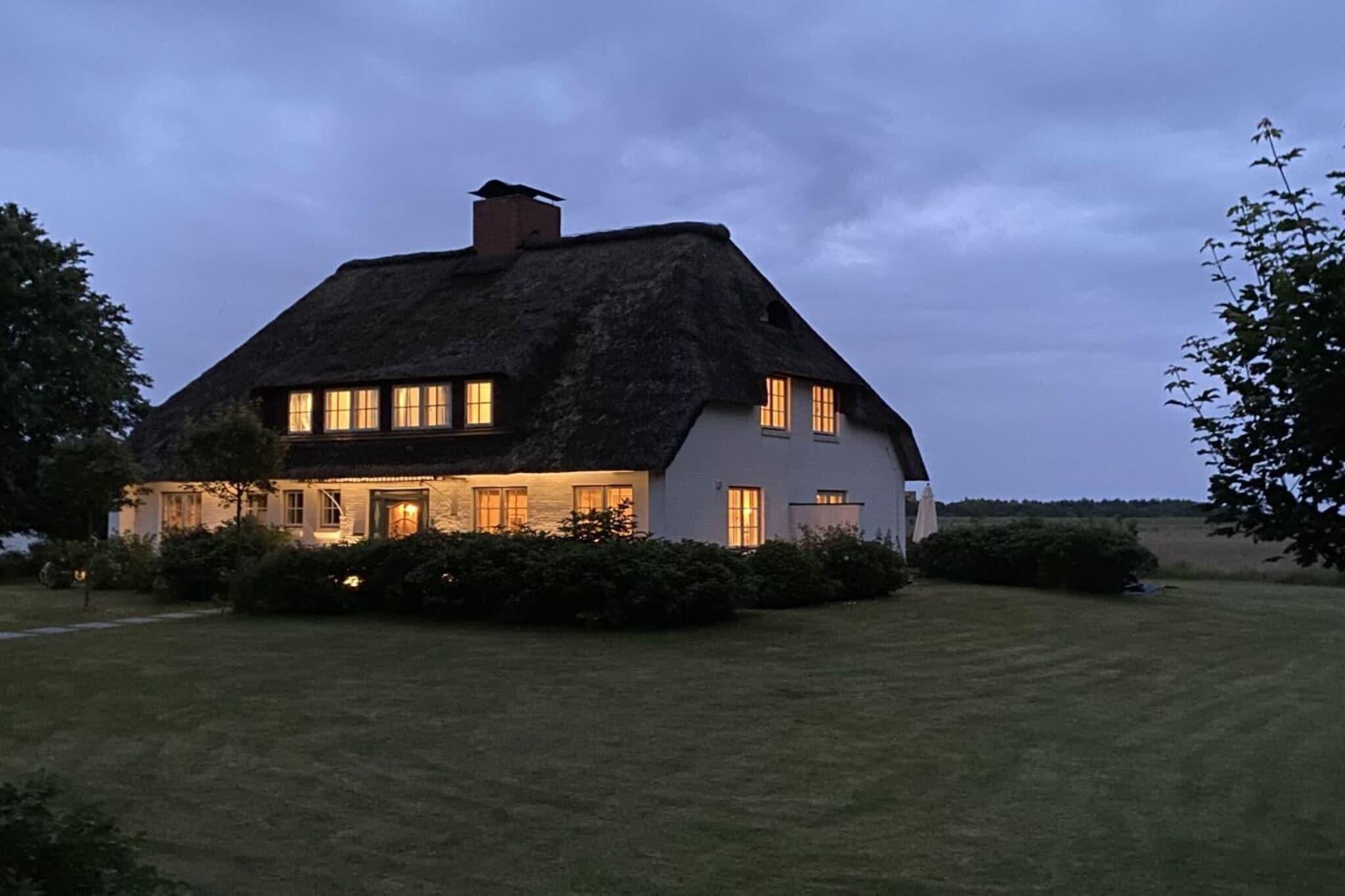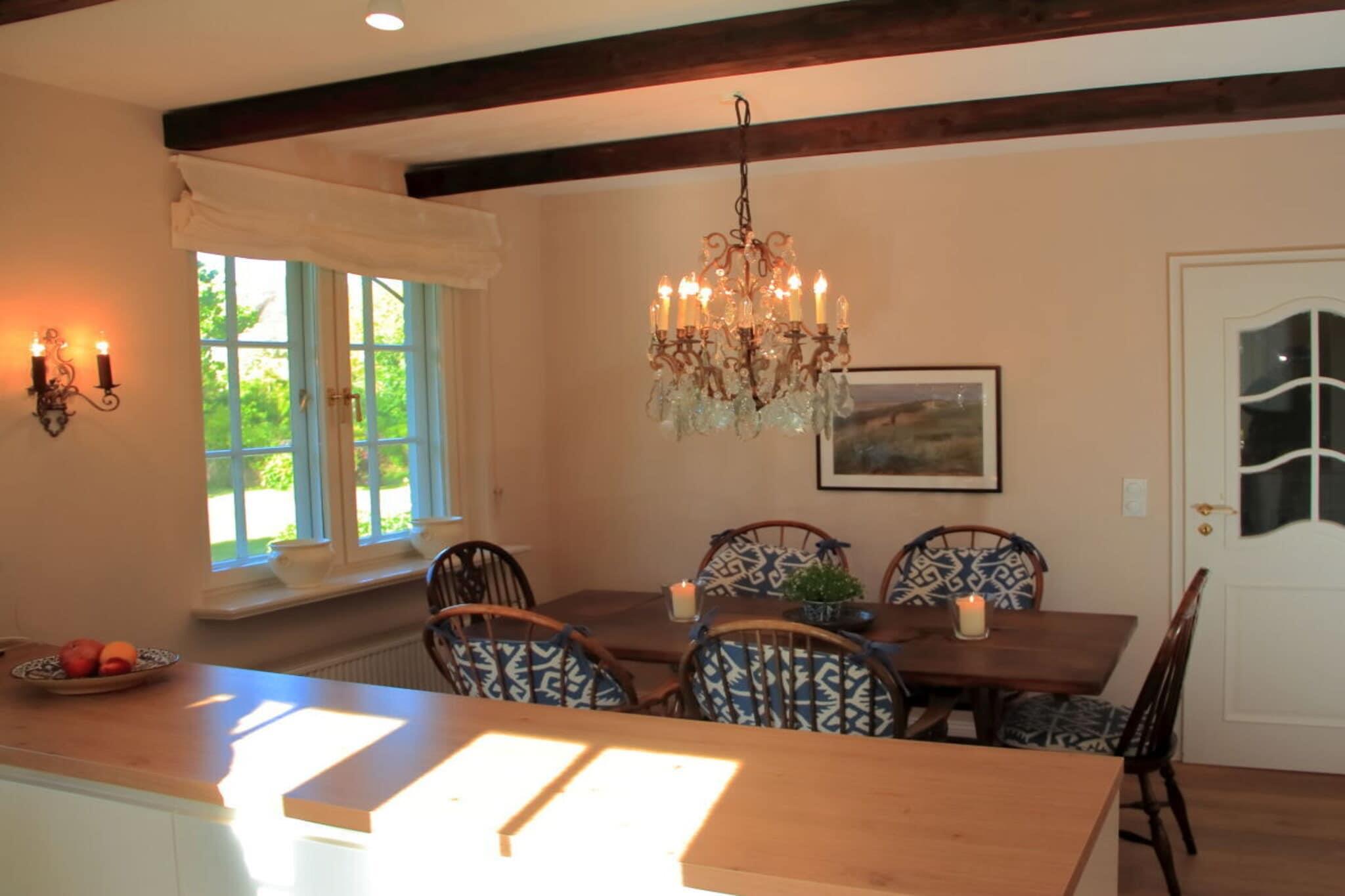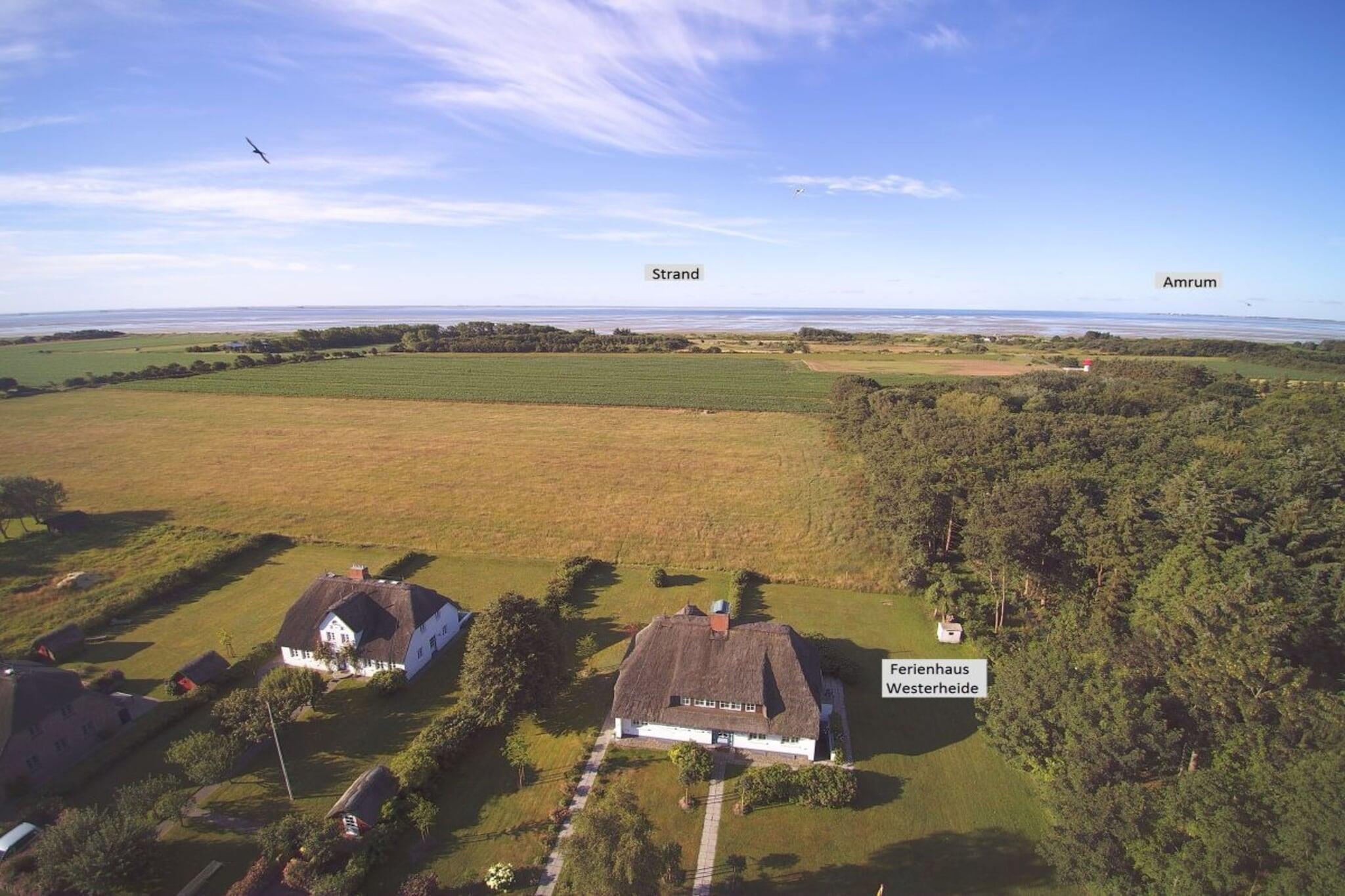 Unsere Hälfte des Ferienhauses Westerheide bietet alles, was man sich für wunderschöne Urlaubstage an der See wünscht: Sowohl den breiten Strand mit dem endlosen Wattenmeer, als auch den romantischen Ortskern von Nieblum erreichen Sie zu Fuß in nur 10 Minuten. Das Haus liegt in absolut stiller Lage mit freiem Blick über die weiten Wiesen und Felder bis zum Deich. Dazu gehören 1500 m² sonniger Südgarten, eine große Terrasse mit Teakmöbeln, sowie ein Strandkorb und fahrbare Liegen zum Faulenzen in der Natur. Innen Gemütlichkeit pur: Im Erdgeschoss finden Sie ein sonniges, nach Süd-Westen ausgerichtetes Wohnzimmer mit einem klassischen Kamin für gemütliche Lesestunden. Daneben eine geräumige Küche mit einer großen Sitzgruppe für gesellige Stunden im Kreis der Familie oder mit Freunden. Im Obergeschoss befinden sich 3 geräumige Doppelschlafzimmer, zwei davon mit weitem Blick bis zum Deich. Das Dritte Doppelschlafzimmer befindet sich in einem abgeschlossenen Bereich. Diese "Einliegerwohnung" ist mit einem eigenen Badezimmer und einem kleinen Flur vom übrigen Bereich getrennt, und wird daher gern von unseren Hausgästen genutzt. Insgesamt gibt es ein großes Vollbad mit Dusche und einer Badewanne, und zwei Bäder mit jeweils einer Dusche. Ein unbegrenzter 16 Mbit High-Speed Internetzugang ist überall im Haus verfügbar, so dass Sie auch bei ungünstigem Wetter nach Herzenslust Unterhaltung finden können.