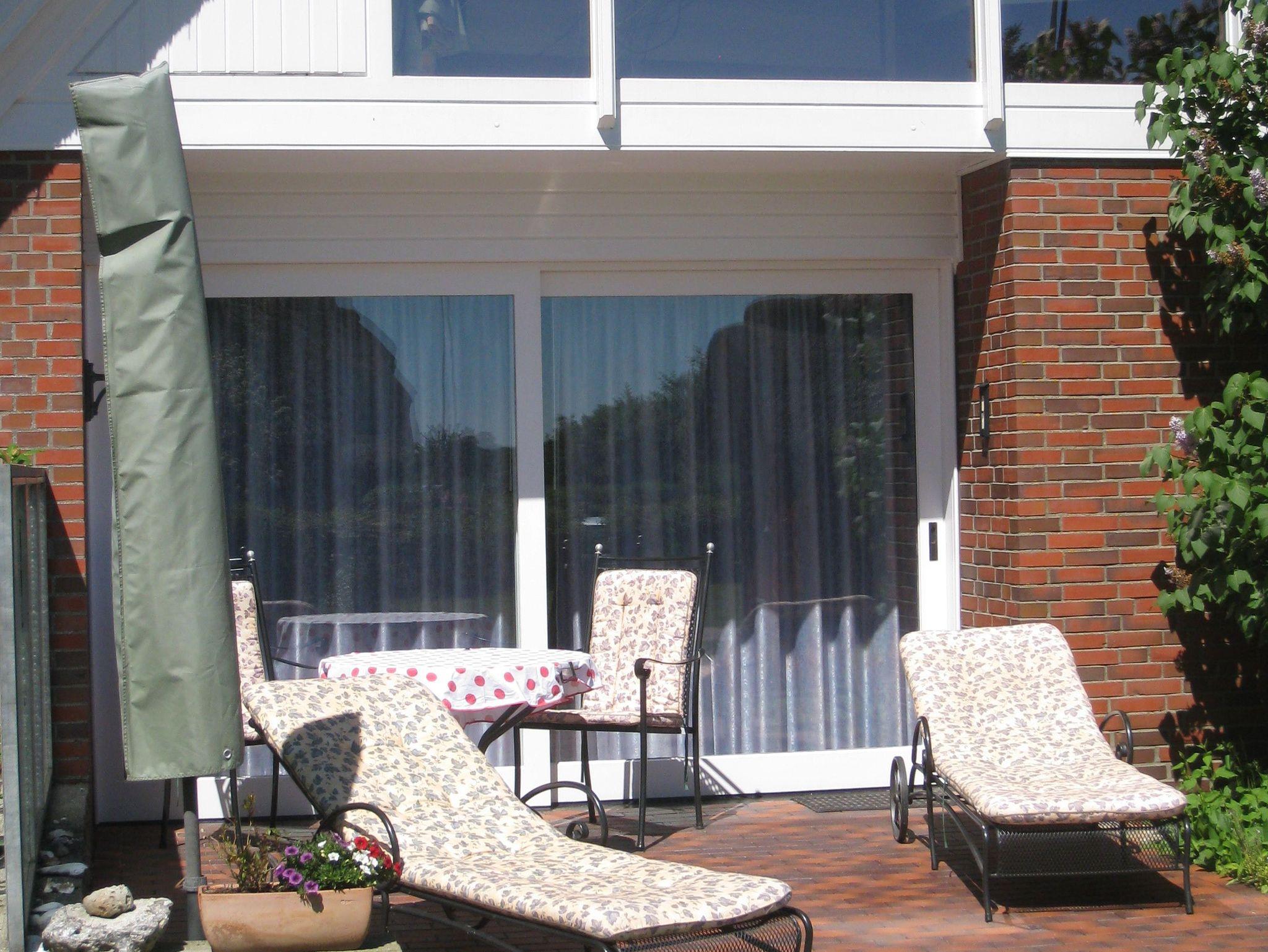 Gemütlicher Terrasse mit Zugang zum Garten, Fahradhäuschen, Sonnenliegen und Privatparkplatz.