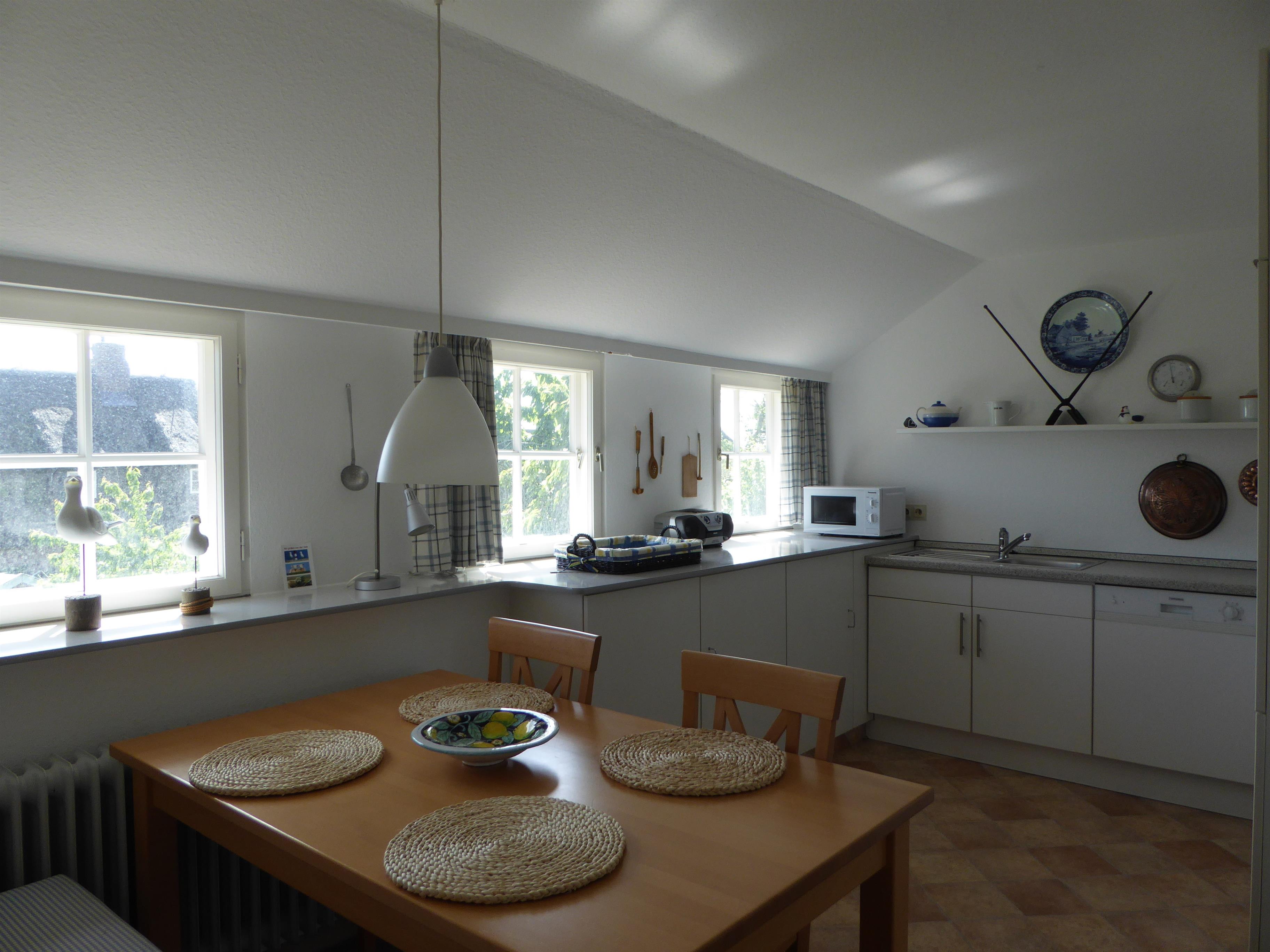Auf einem sonnigen Gartengrundstück am Ende einer Sackgasse liegt die schöne und ruhige Ferienwohnung in Nieblum/Föhr. Die großzügig geschnittene Wohnung im 1. Obergeschoß bietet Platz für 4 Personen plus Kleinkind.