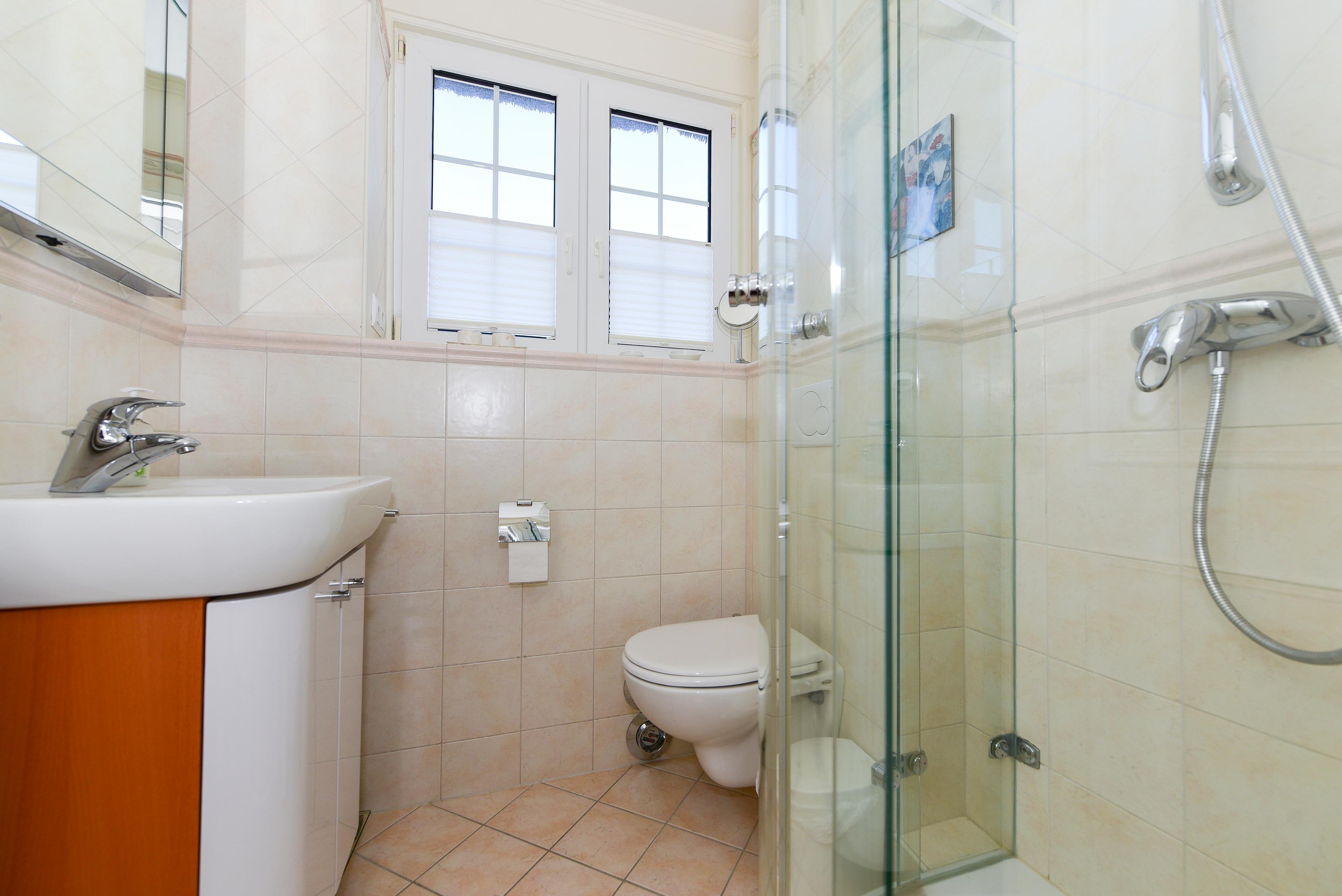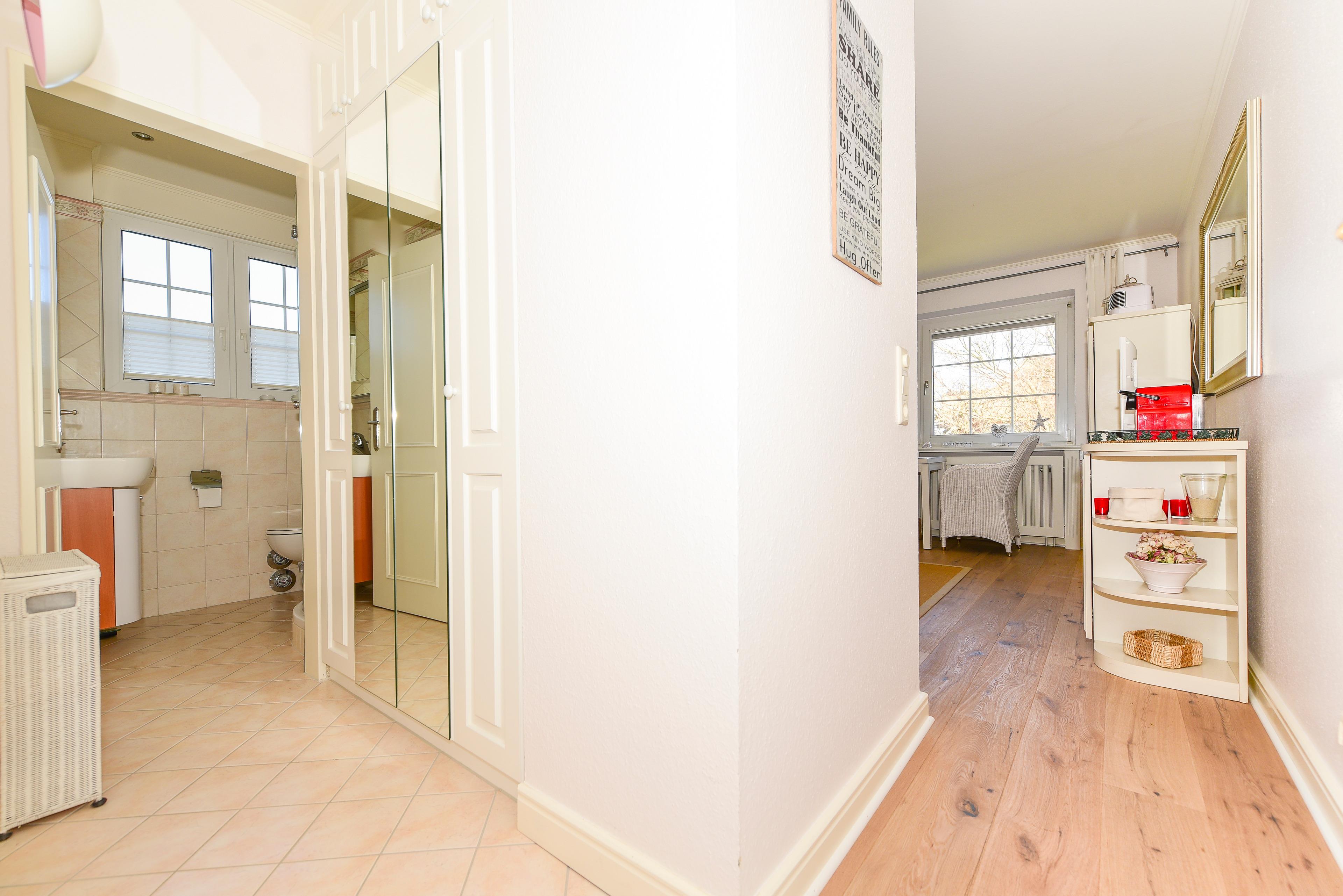 Ein großzügiger Einbauschrank sorgt für ausreichend Platz für Ihre Urlaubsgarderobe, und das Duschbad, mit einem Außenfenster, ist lichtdurchflutet und freundlich.