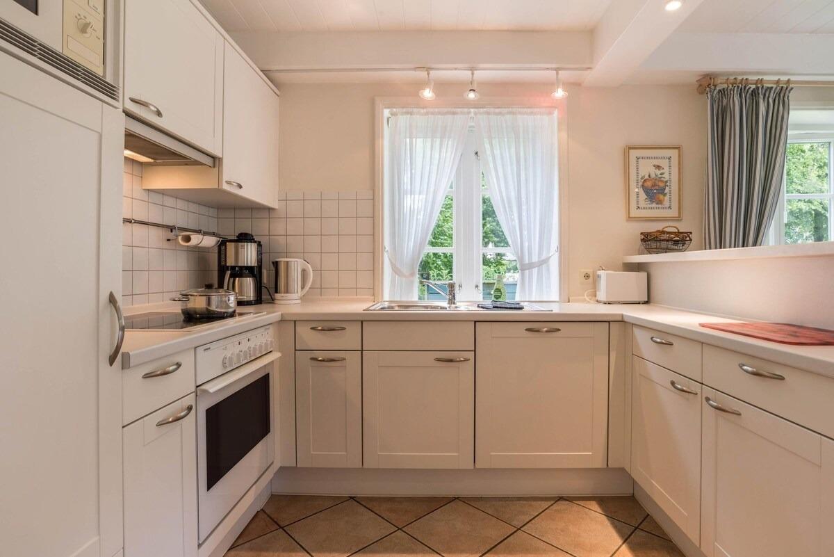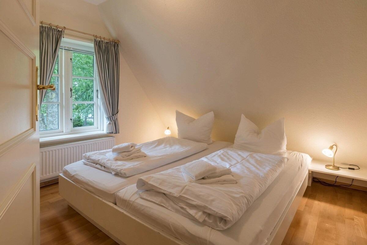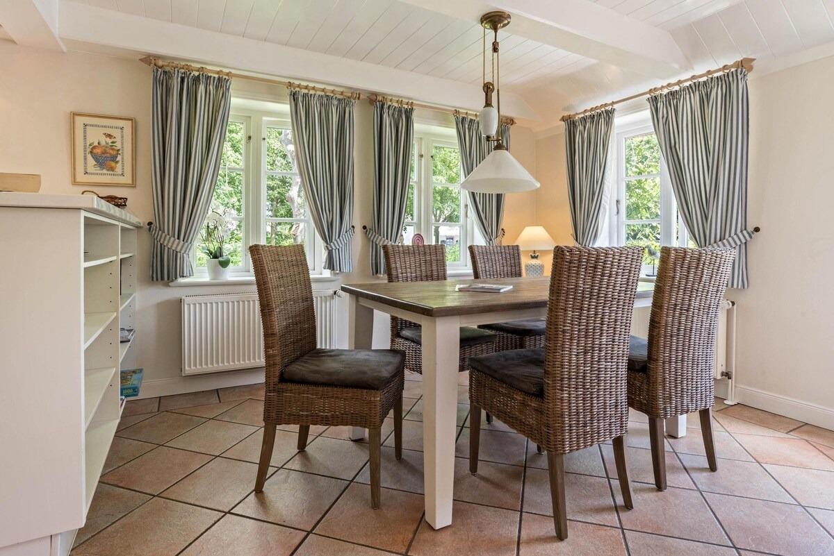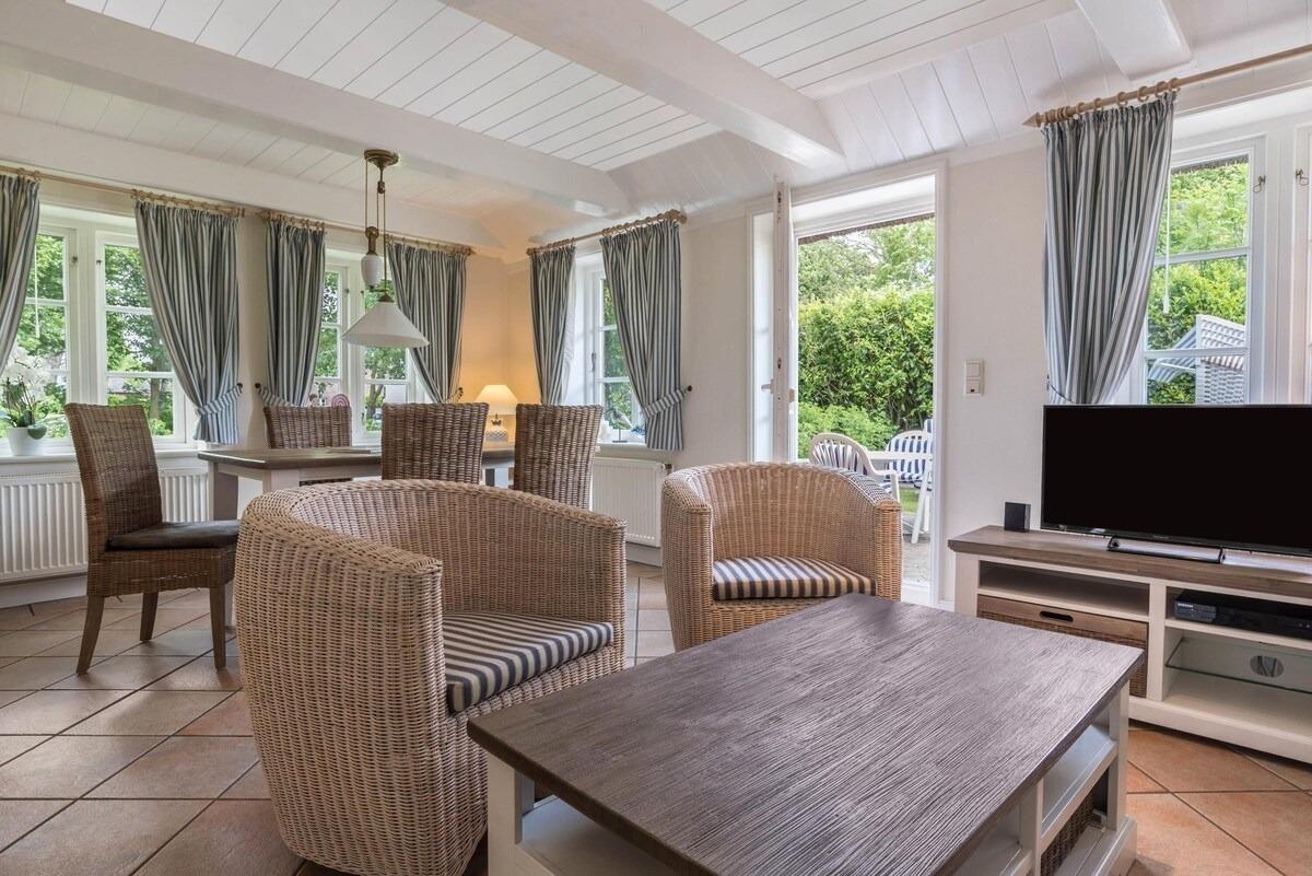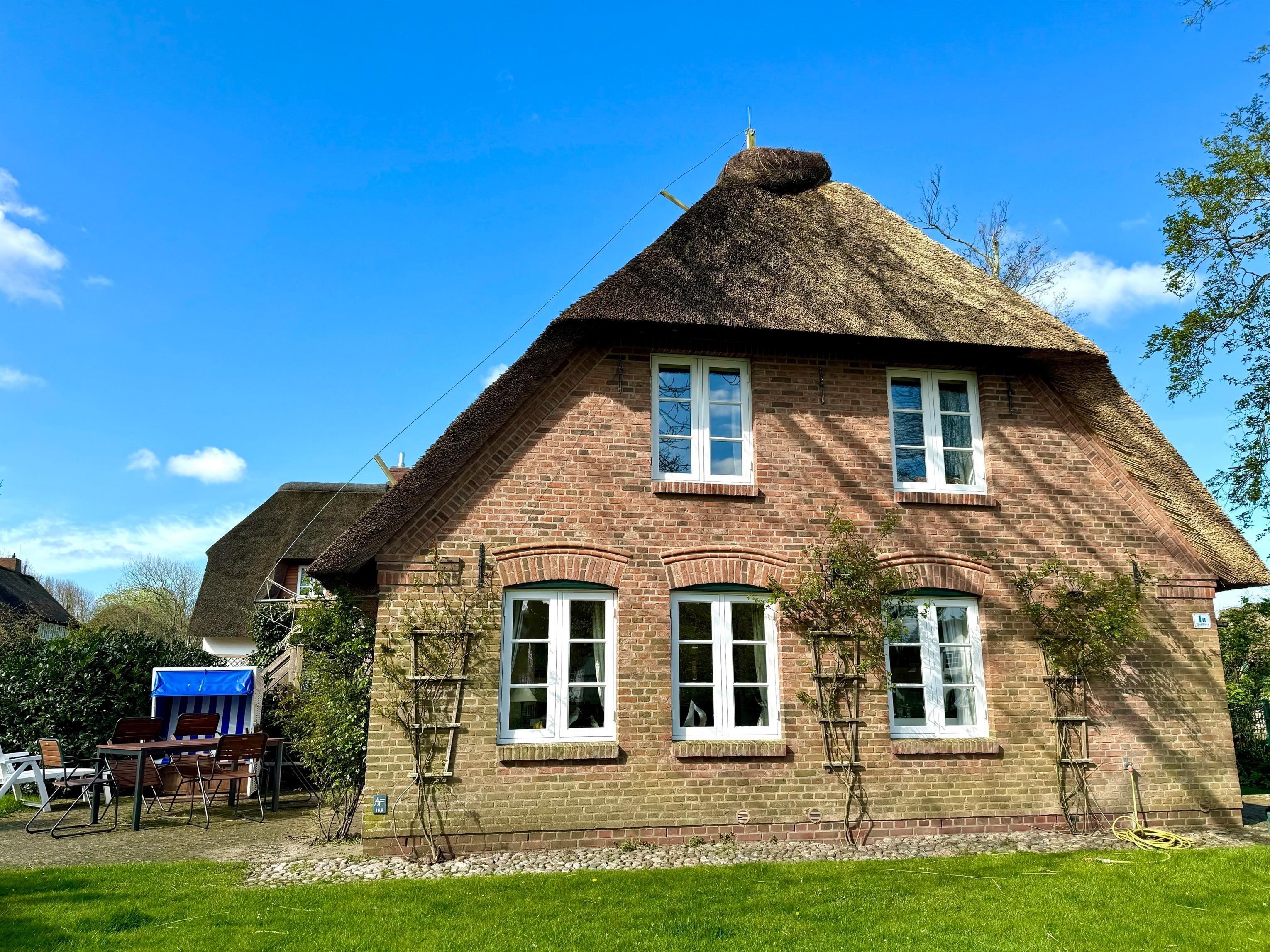 In dem malerischen Dorf Nieblum auf der Insel Föhr liegt die schöne Reetdach-Ferienwohnung "Ferienwohnung Osterhus". Sie ist perfekt für einen Pärchen-, Familien- oder Strandurlaub an der Nordsee und besticht durch ihren gemütlichen Charme und ansprechenden Finca-Stil. Die 80 m² große Ferienwohnung besteht aus einem Wohnzimmer, einer sehr gut ausgestatteten Küche, 3 Schlafzimmern, einem Bad sowie einem Gäste-WC und bietet somit Platz für bis zu 5 Personen. Zur weiteren Ausstattung gehören WLAN, Heizung, Waschmaschine, Trockner und Satellitenfernsehen. Die offene, möblierte Terrasse mit Sonnenschirm und traditionellem Strandkorb sowie der gemeinschaftlich genutzte Garten laden zu entspannten Stunden im Freien ein. Der Nieblumer Strand ist nur 900 m entfernt (4 Autominuten oder 15 Gehminuten). Dort finden Sie einen Parkplatz für Ihr Auto sowie einen Hundestrand, an dem auch Ihr vierbeiniger Freund willkommen ist.