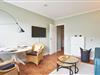 Das lichtdurchflutete Wohnzimmer hat große Fenster nach Süden. Ein runder, variabel einstellbarer Eßtisch mit zwei Korbsesseln lädt zu ausgedehnten Mahlzeiten ein. Das sehr variable, diskrete Designer-Sofa wartet auf Liebhaber ausgedehnter Lese-Abende. Oder sind Sie im Home-Office? Ein cleverer Designer-Sekretär mit integriertem Licht, Steckdosen und USB-Anschluss sorgt für angenehmes Arbeiten. Für moderne Unterhaltung sorgen ein NanoCell Smart-TV von LG (2022) und Wlan. Vom Wohnzimmer aus gelangen Sie über eine Glastür auf die großzügige, ruhige Terrasse, die den ganzen Tag in der Sonne liegt und einen ruhigen, schönen und weiten Blick ins Grüne bietet. Auflagen für die Sitzmöbel finden Sie in der Truhe.