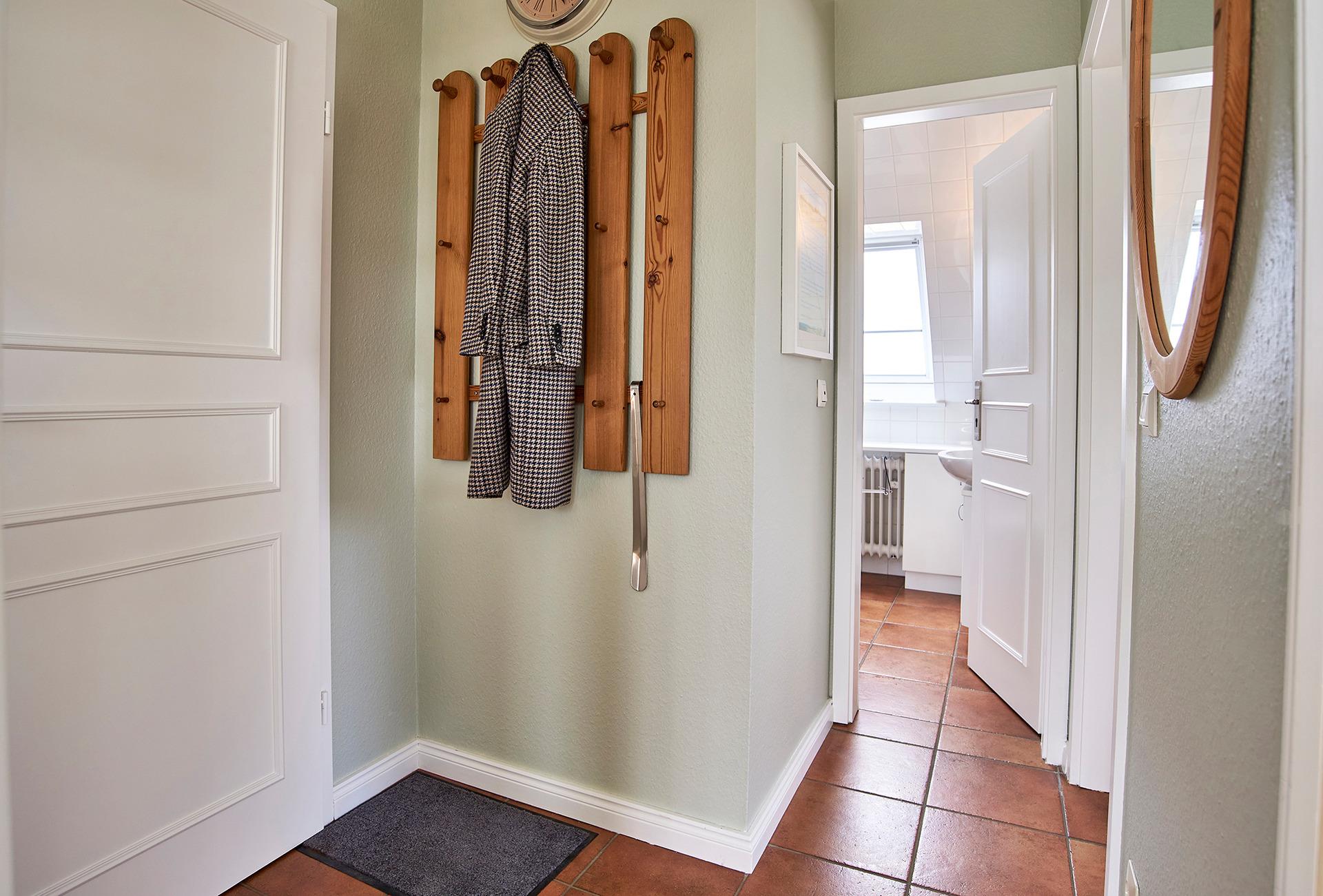 Vom Gemeinschaftseingang des Hauses gelangen Sie über eine Treppe zu Ihrem eigentlichen Urlaubsdomizil. Es stehen Ihnen ein helles, großzügiges Wohnzimmer mit Essgruppe und moderner Einbauküche, ein Schlafzimmer mit Doppelbett und ein Duschbad/WC zur Verfügung.