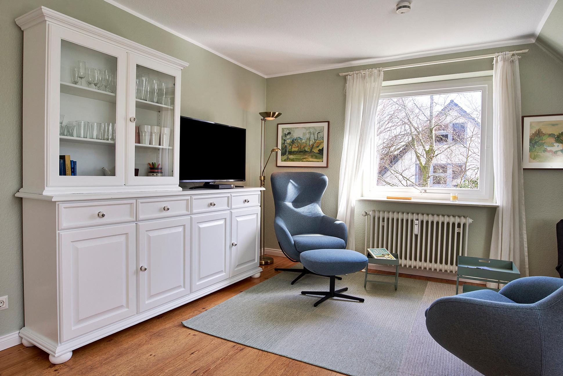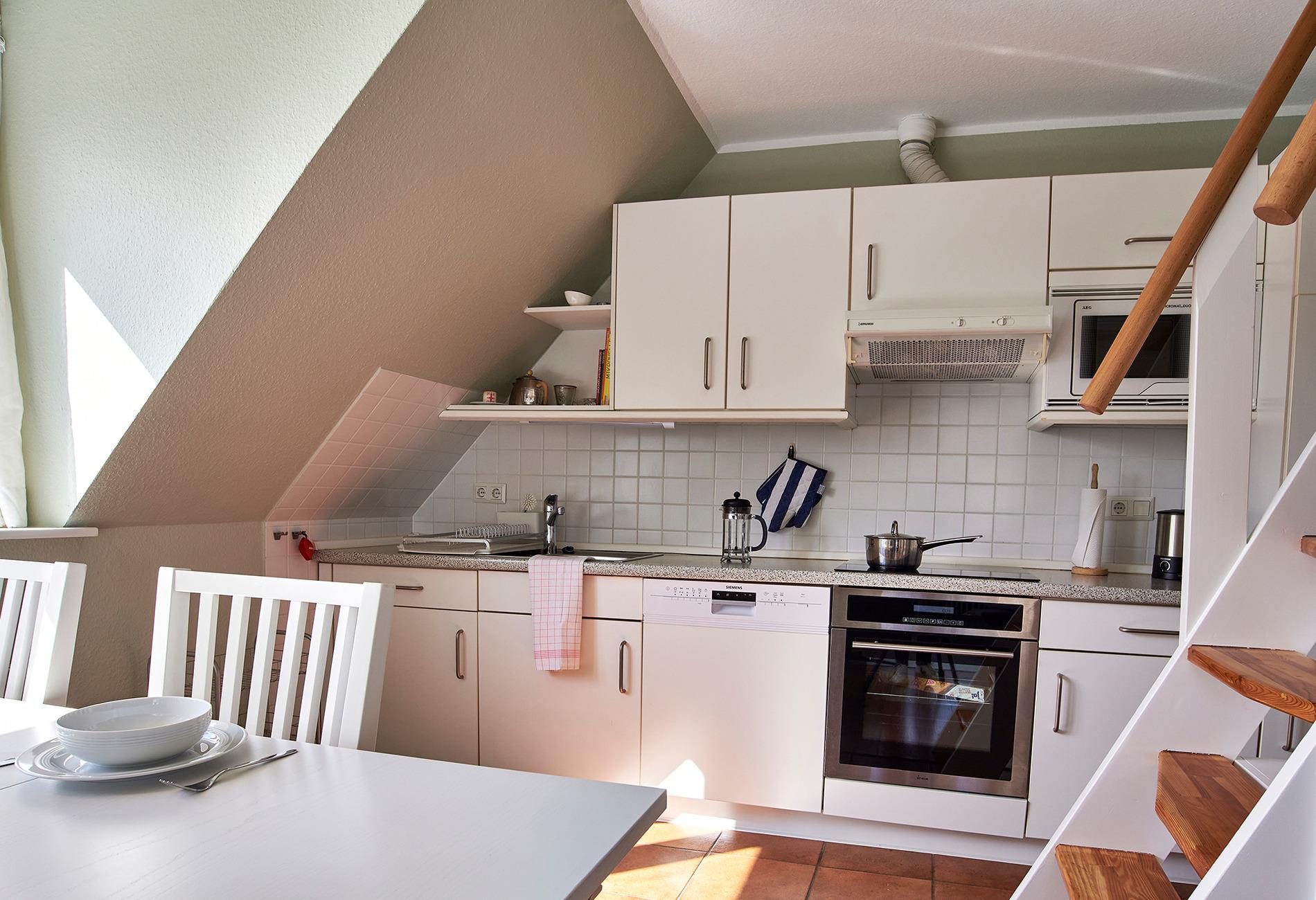In der modernen, voll ausgestatteten Küche finden Sie unter anderem Induktionsherd mit Backofen, Kühlschrank mit Gefrierfach, Mikrowelle, Geschirrspüler, WMF-Smoothie-Mixer, Nespresso-Maschine, Filter-Kaffeemaschine, Wasserkocher, Toaster, Handrührer sowie allerlei Pütt und Pann zum Kochen und Backen. Geschirr und Besteck sind für 8 Personen vorhanden. Im Wohnzimmerschrank finden Sie eine große Auswahl neuer, hochwertiger Gesellschaftsspiele, für Entspannungstraining sorgt eine Yogamatte mit –blöcken und –gurt.