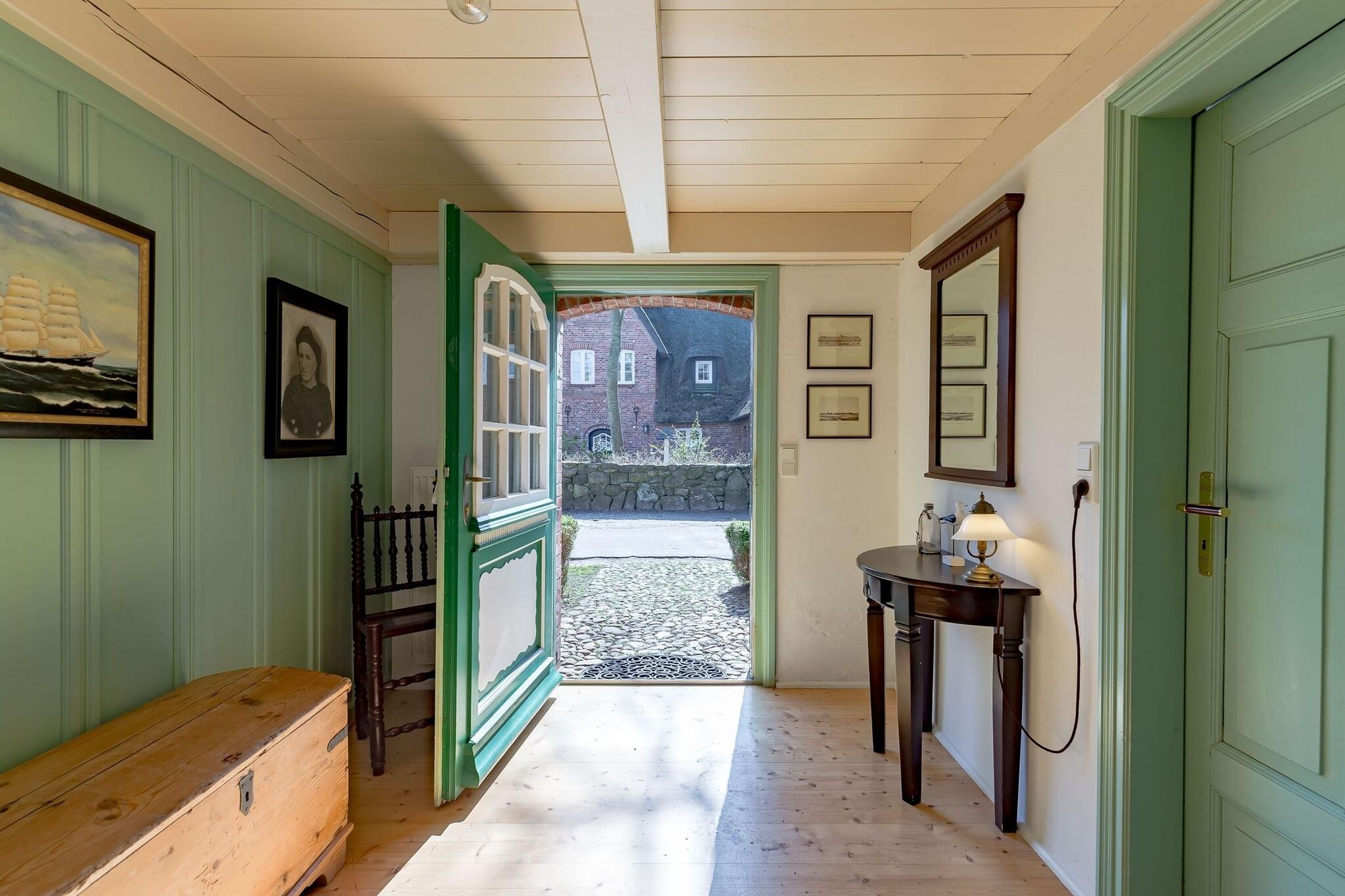 Das reetgedeckte Alte Kapitänshaus wurde 1743 in Nieblum mit Blick auf den Friesendom St. Johannis errichtet. Während der wechselvollen Geschichte des Hauses lebte in dem Haus auch Hay Volkerts , der viele Jahre zum Walfang auf See war und es zu einigem Ruhm gebracht hatte. Jahre später kaufte es Jacob Jacobsen, den es nach erfolgreicher Goldgräberei in Australien wieder auf seine Heimatinsel Föhr zog. Das Haus wurde von Grund auf renoviert und dabei die ursprüngliche Raumaufteilung mit Dörnsk und Pesel wiederhergestellt. Bei der Restaurierung wurde viel Wert auf historische Materialien gelegt. Von dem 1000 Jahre alten Eichenholz, das ursprünglich aus der St. Johannis Kirche stammt und in diesem Haus als Baumaterial Verwendung fand, ist noch ein Rest im neuen Bad erhalten. Neugierig geworden auf das Alte Kapitänshaus im malerischen Nieblum, dem wohl schönsten Dorf von Föhr?