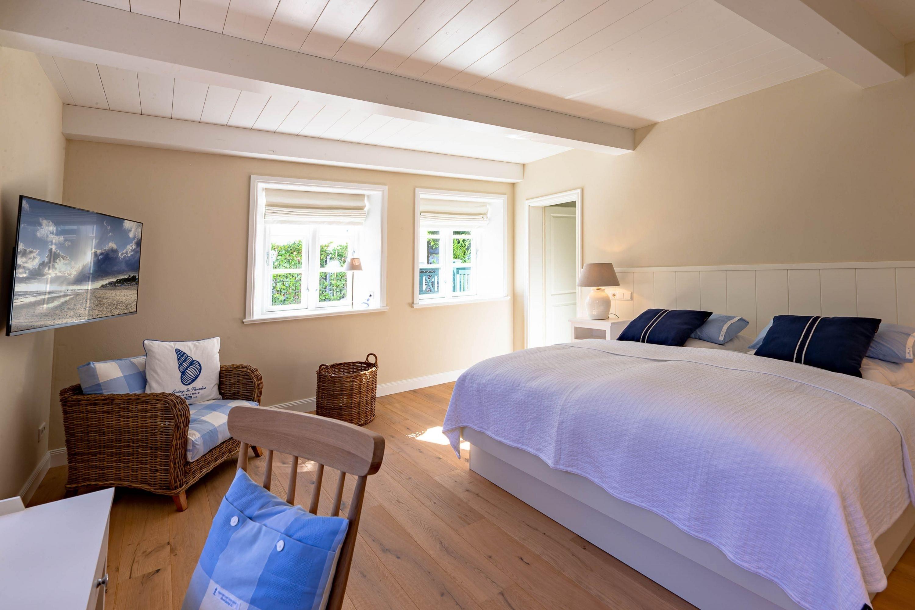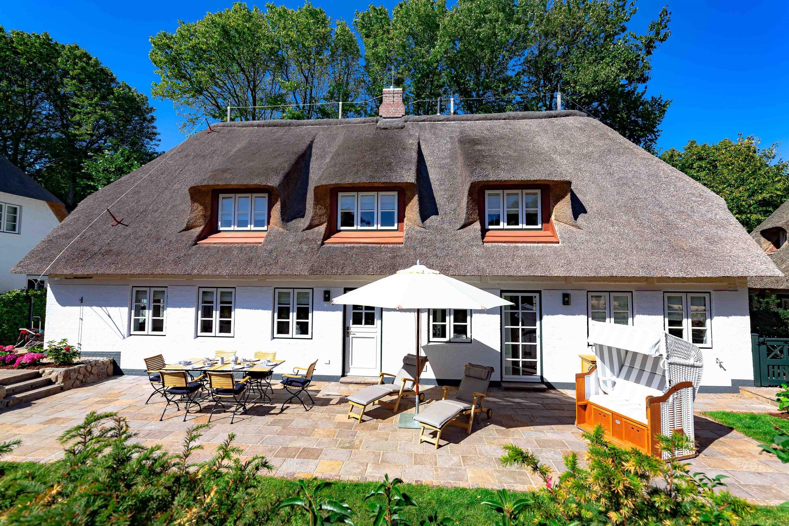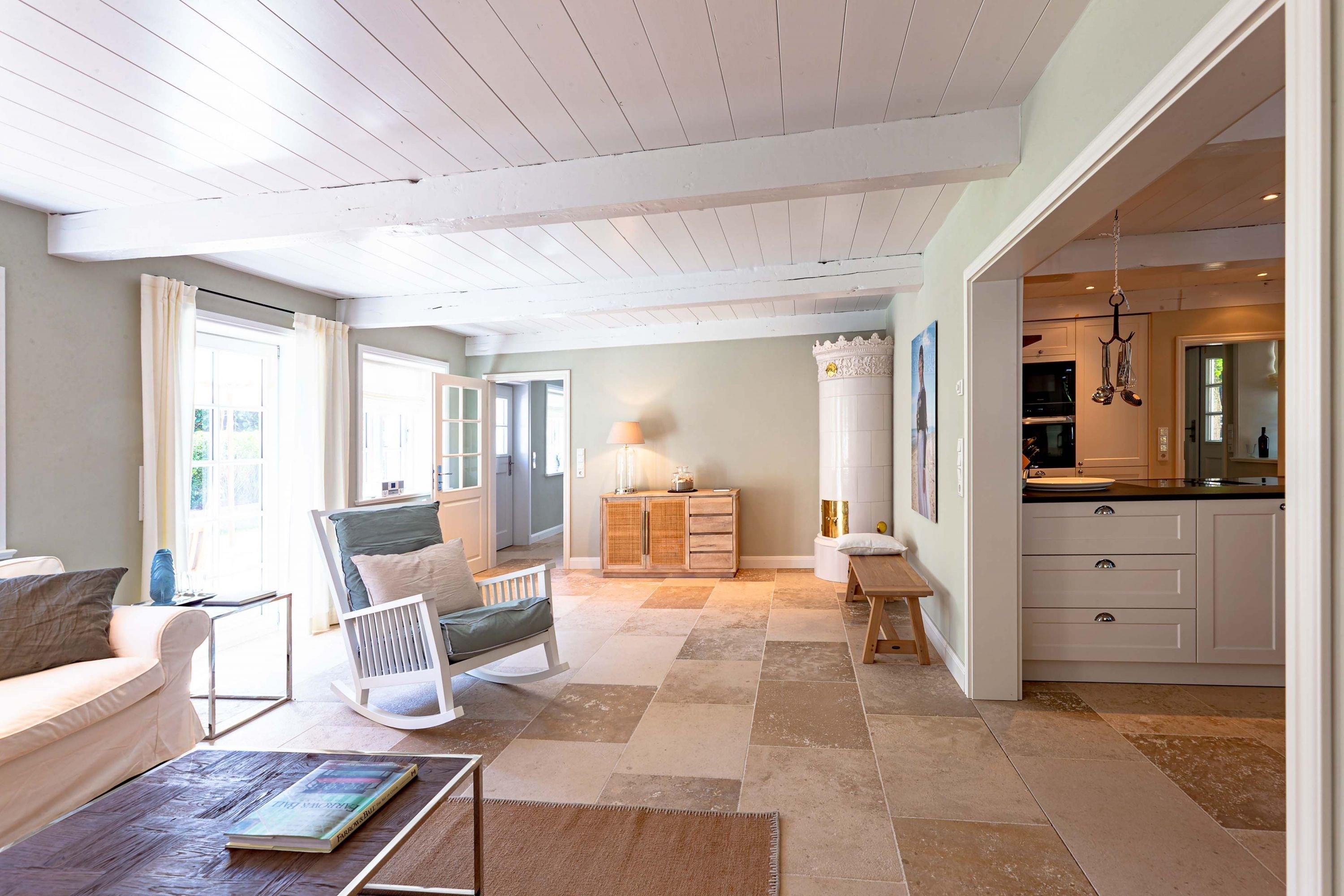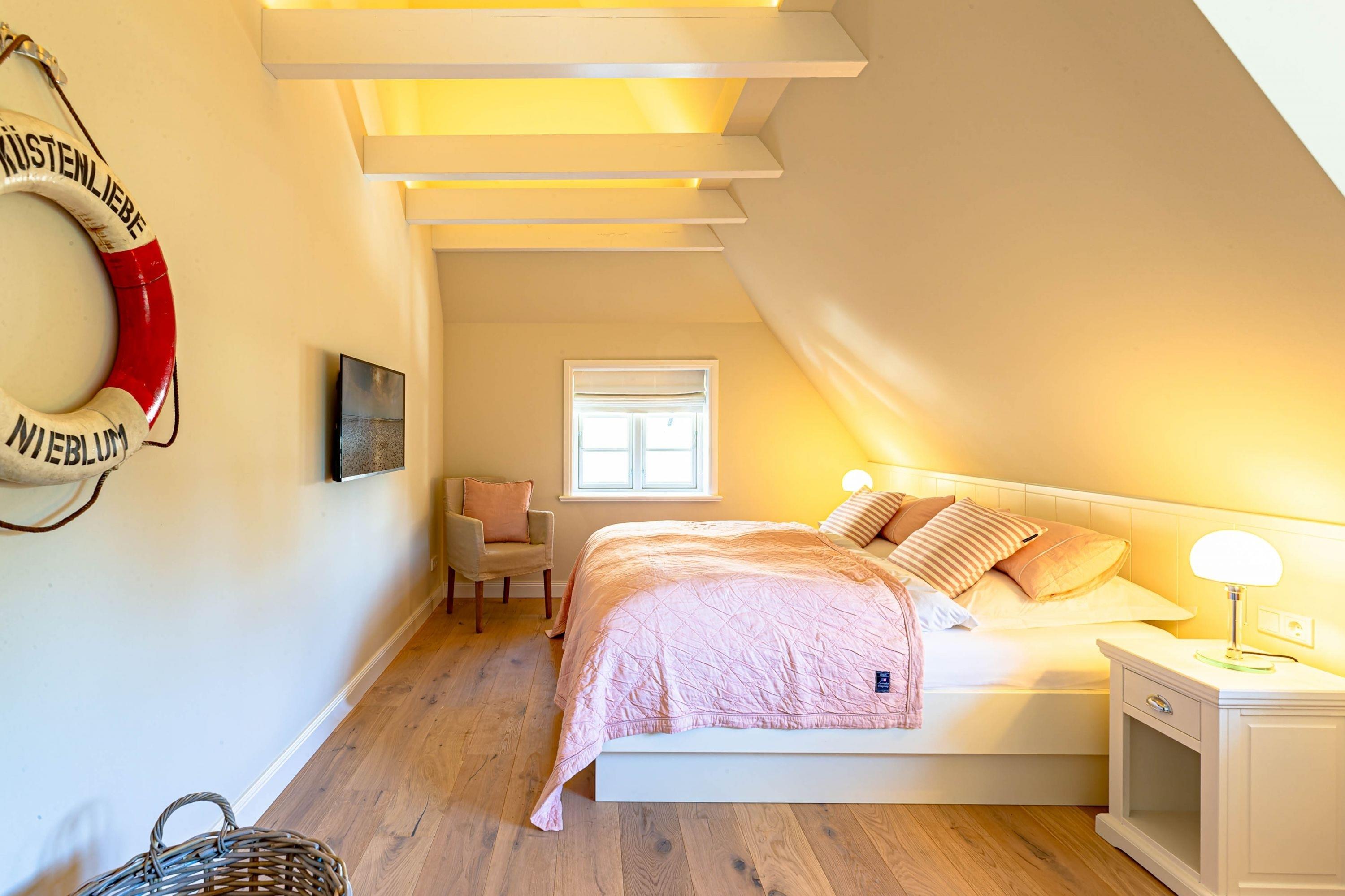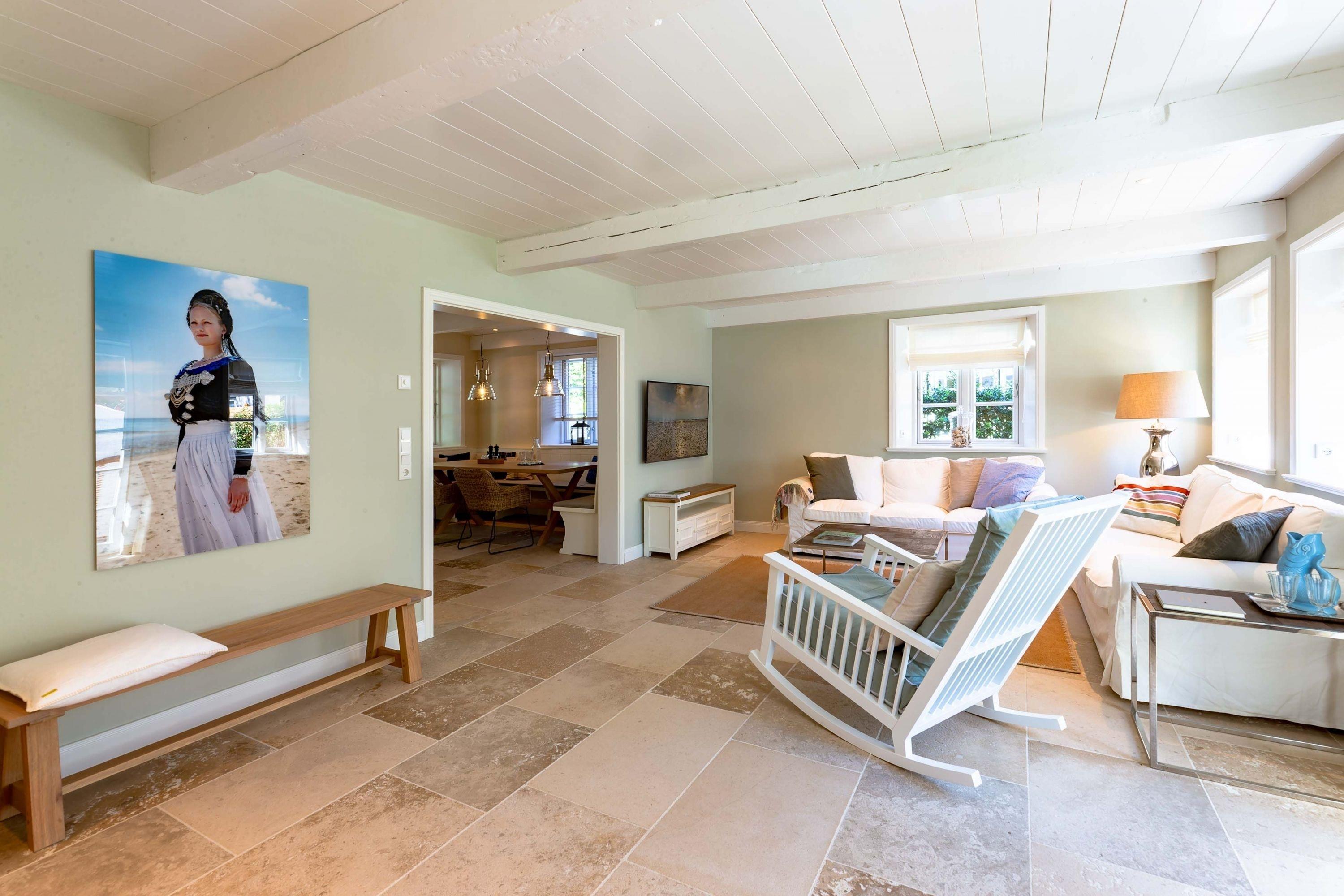 Die „Küstenliebe Nieblum“ befindet sich im Dorfkern von Nieblum, dem wohl schönsten Dorf der Insel. Das denkmalgeschützte, 200qm große Kapitänshaus von 1799 wurde mit viel Sorgfalt und Liebe hochwertig renoviert und stilvoll eingerichtet. Im Haus finden 6 Personen Platz. Ein Schlafzimmer befindet sich im Erdgeschoss, zwei weitere im Obergeschoss. Jedes Schlafzimmer verfügt über ein eigenes Bad. Ein separates Gäste-WC befindet sich zusätzlich im Erdgeschoss. Die offene Küche bietet einen exklusiven Herd und eine hochwertige Küchenausstattung. An der straßenabgewandten Südseite des Hauses liegt der schöne, umschlossene Garten mit Friesenwall. Der historische Kachelofen von 1840, aber auch die Natursteinböden, die großzügige Diele mit separatem Garderobenraum und die offene Balkendecke im oberen Schlafzimmer geben der „Küstenliebe Nieblum“ besonderen Charme. Der idyllische Friesenort Nieblum ist geprägt von Bauerngärten, verwinkelten Gassen und Friesenhäusern und wurde bereits als schönstes Dorf Deutschlands ausgezeichnet. Bäckerei, Fisch- und Feinkostgeschäft, Fahrradverleih, Restaurants und mehr befinden sich in fußläufiger Nähe. Der Strand ist 1200 m entfernt. Wer das Besondere sucht und sieht, ist in der „Küstenliebe Nieblum“ richtig