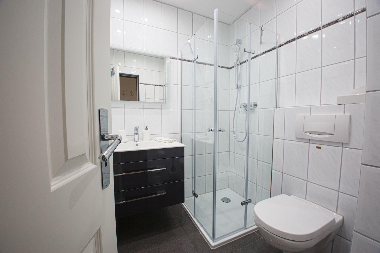 Das ebenfalls nagelneue, hochwertige und sehr moderne Duschbad lässt ebenfalls keine Wünsche offen.