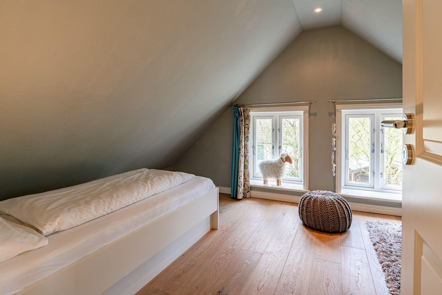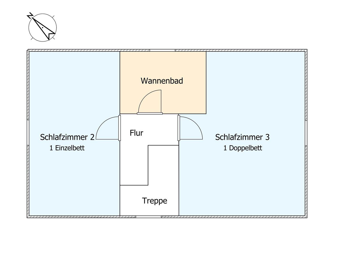 Ein Schlafzimmer mit Doppelbett und eines mit einem Einzelbett sowie ein Duschbad befinden sich im Obergeschoss.