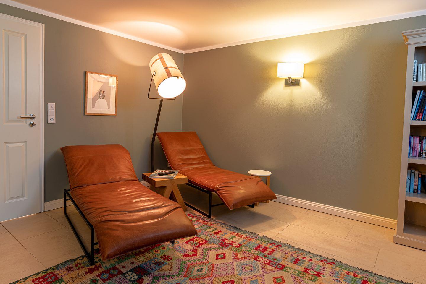 Im Souterrain befindet sich die Sauna mit einer separaten Dusche sowie ein weiteres Wohnzimmer bzw. Wellnesszimmer. Dieser Aufenthaltsraum kann sowohl als Rückzugsort dienen, um über die klangvolle Soundanlage Musik zu hören, Fernsehen zu gucken oder auch nur um ein Buch zu lesen. Neben einer kuscheligen, großen Sofalandschaft stehen hier auch zwei Wellnessliegen bereit, sodass nach einem Saunagang relaxt werden kann. Der Hauswirtschaftsraum verfügt über Waschmaschine, Trockner und allem, was Sie im Urlaub benötigen könnten, wie Bügeleisen, -brett und Co.