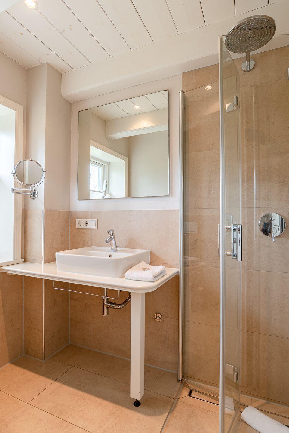Das Haus wird über das Erdgeschoss betreten. Neben der Haustür lässt sich auch die Terrassentür von innen mit dem Schlüssel öffnen und verschließen. Das Herzstück des Hauses bildet der offene Wohn-, Ess- und Küchenbereich mit Kaminofen. Die Küche ist sehr vielfältig ausgestattet. Ein Schlafzimmer befindet sich im Erdgeschoss. Das Bett verfügt über einen erhöhten Einstieg und eine Breite von 160 cm. Es ist damit ideal für Senioren geeignet. In dem vom Tischler gebauten Einbaukleiderschrank steht Ihnen ein Safe zur Verfügung. Eines der zwei Bäder mit bodengleicher Dusche befindet sich im EG, Tür an Tür zum Schlafzimmer gelegen.