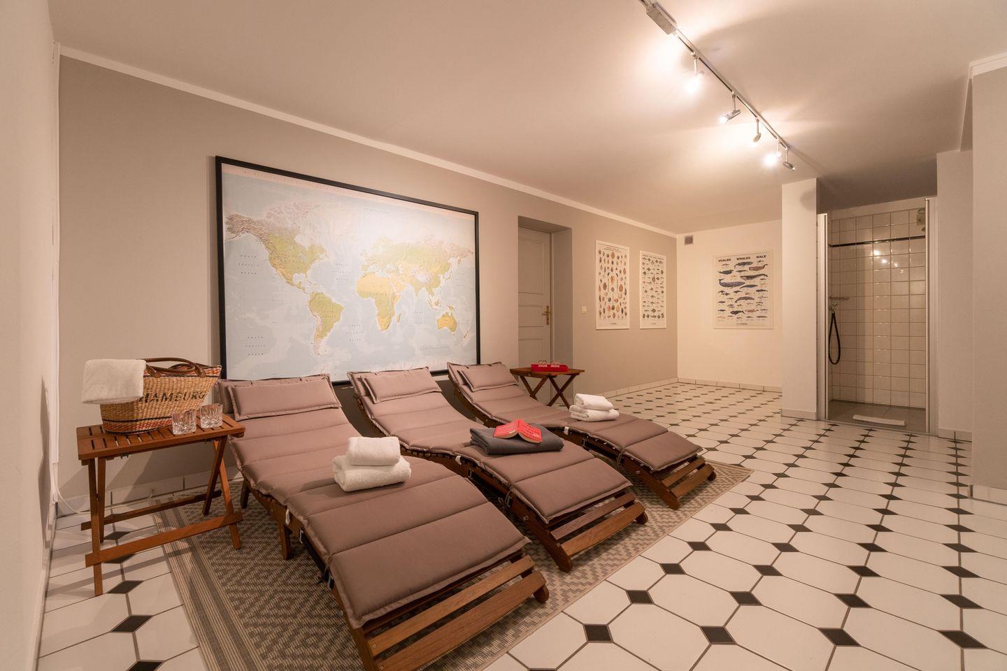 Zu den Highlights der Ferienunterkunft zählen wir u. a. die hauseigene Sauna mit Wellnessbereich, den antiken Kachelofen, sowie den Garten mit Terrasse und Strandkorb.