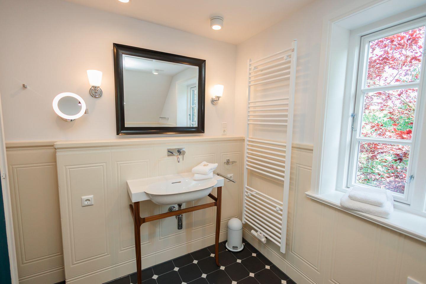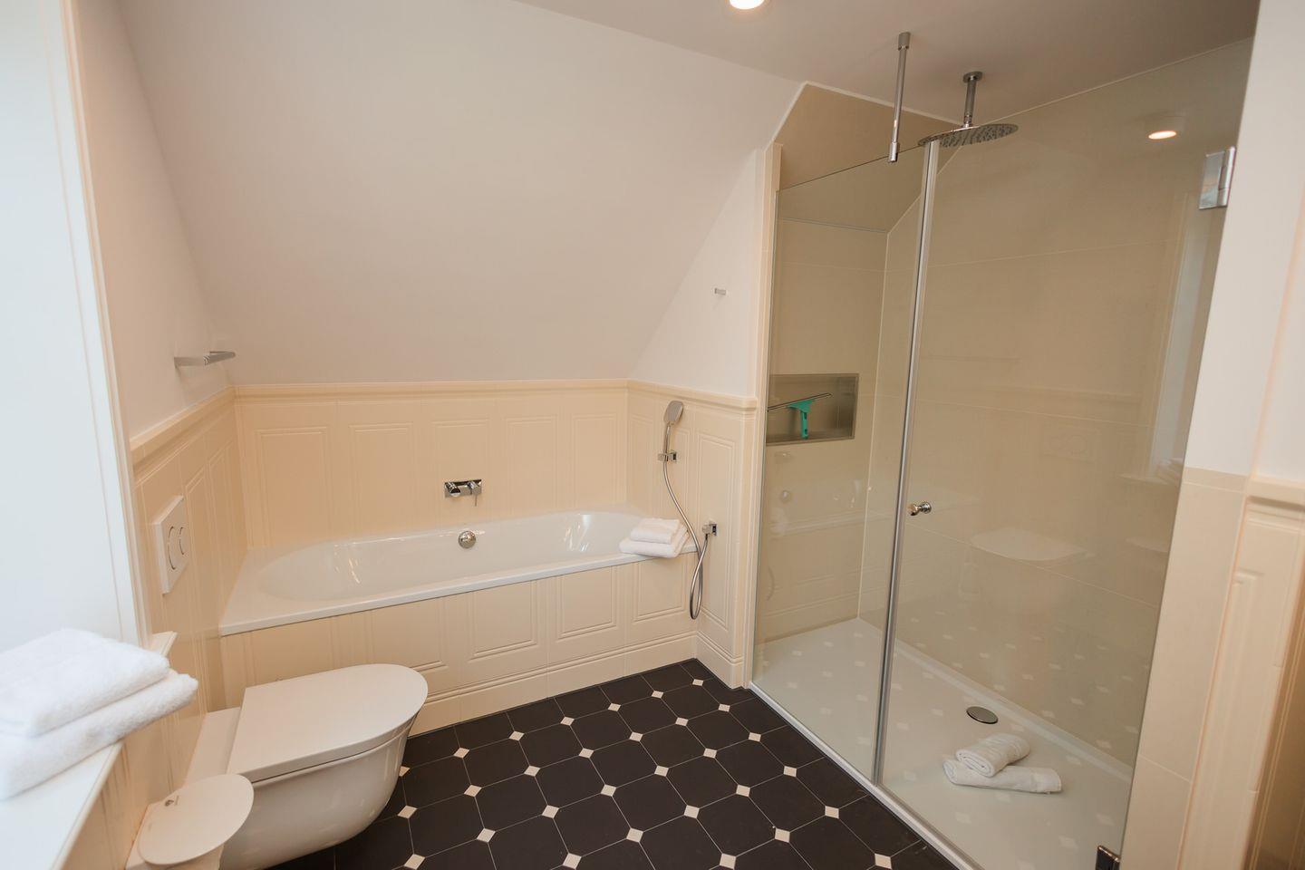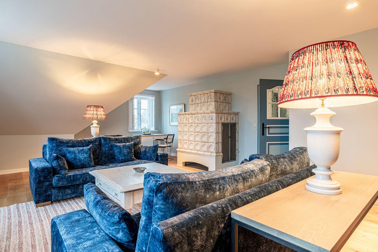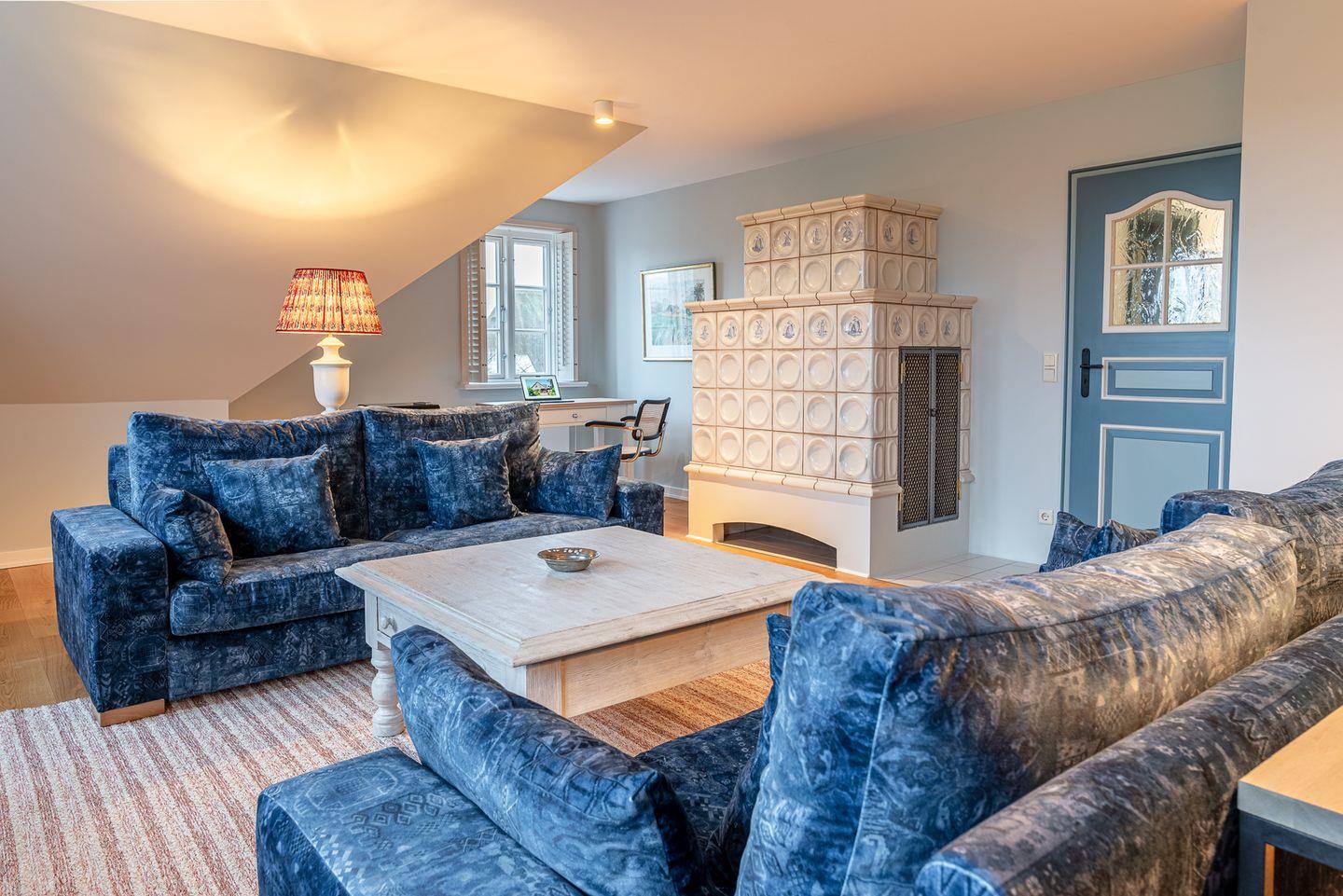 Im Obergeschoss sind zwei weitere Schlafzimmer mit Doppelbett, ein Vollbad mit Badewanne und Raindance-Dusche sowie das zweite Wohnzimmer gelegen. Das Wohnzimmer, welches ebenfalls über einen Kachelofen verfügt, bietet einen schönen Ausblick auf die umliegende Landschaft.