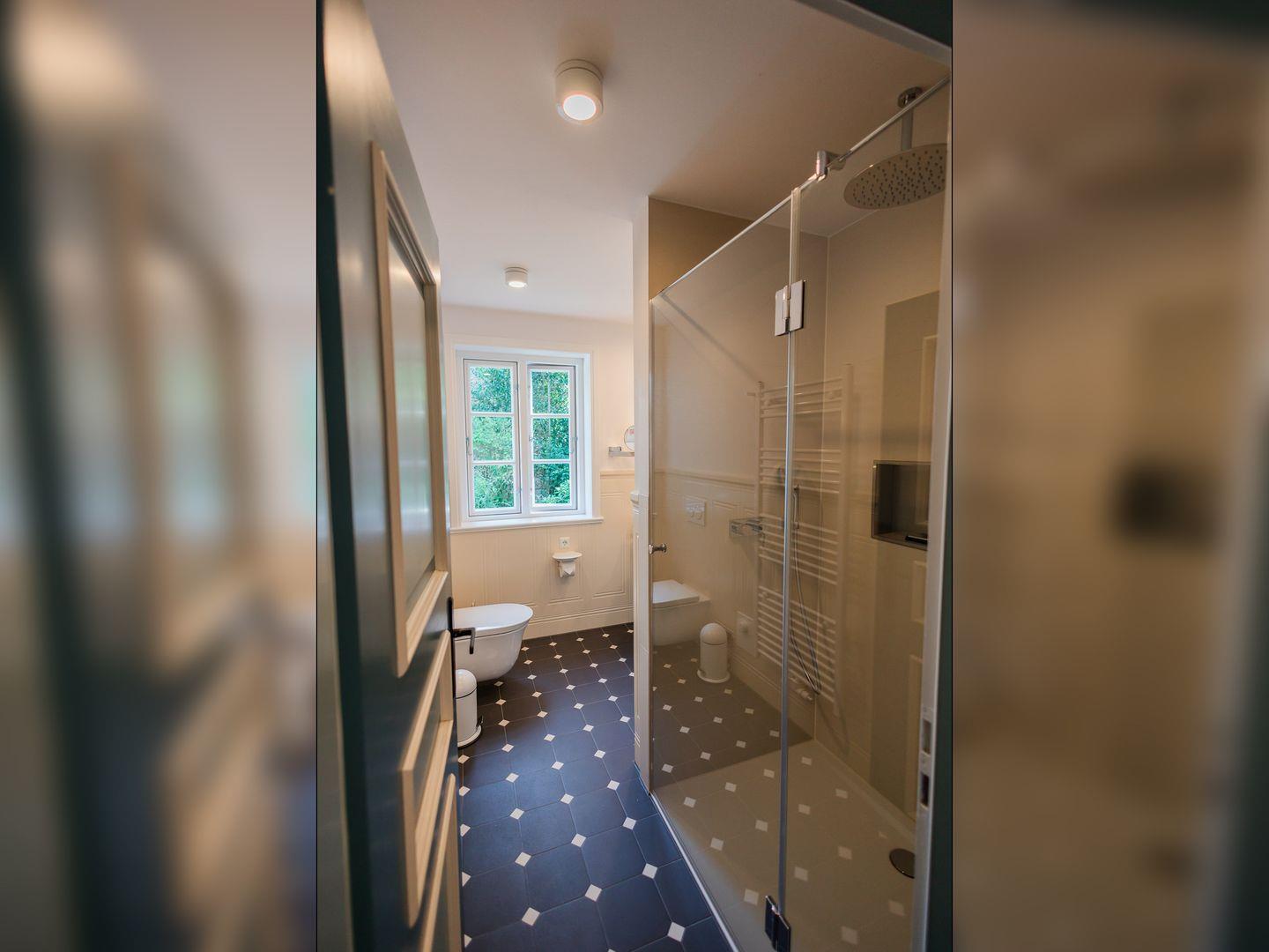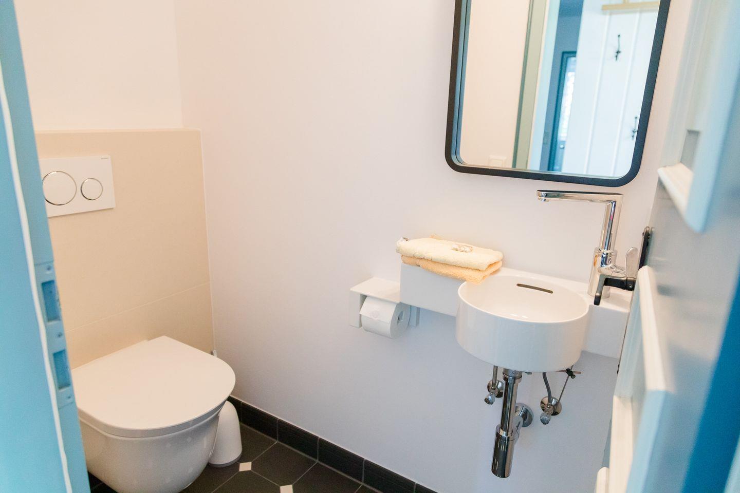 Im Erdgeschoss befinden sich der großzügige Wohn- und Essbereich mit offener Küche, ein Schlafzimmer mit Doppelbett, ein Duschbad sowie das Gäste-WC. Der Original Mylin-Kachelofen sorgt auch an kühleren Tagen für eine angenehme Atmosphäre. Über den Wohnbereich gelangen Sie direkt auf die Terrasse und in den Garten.