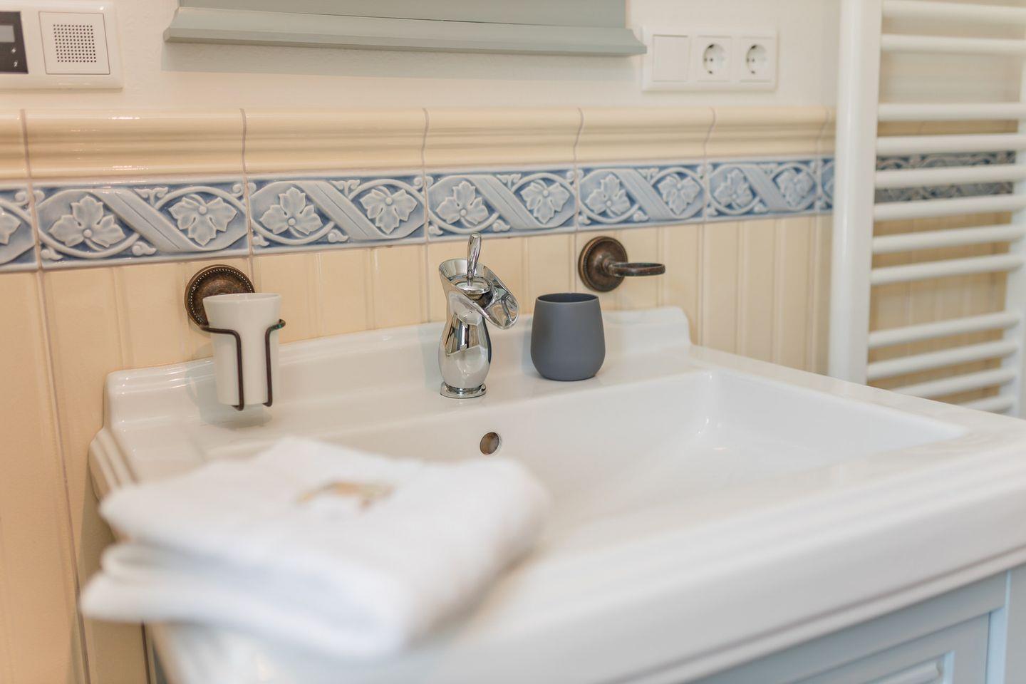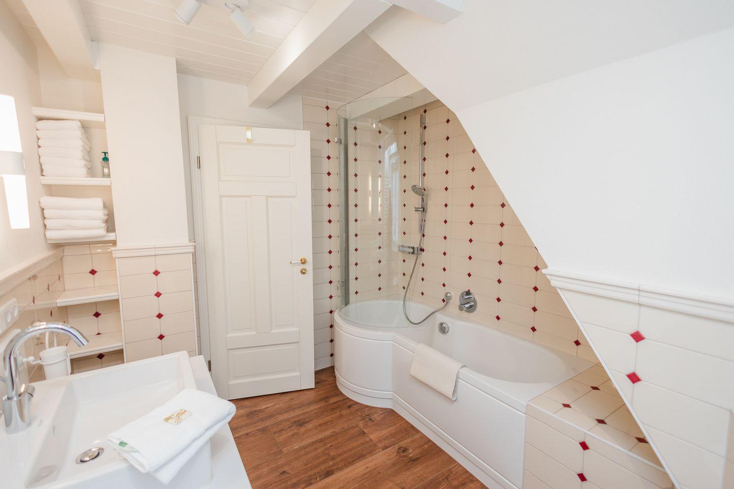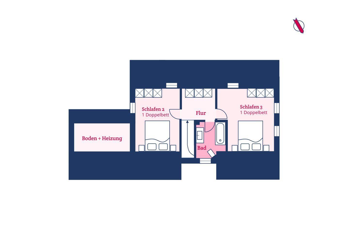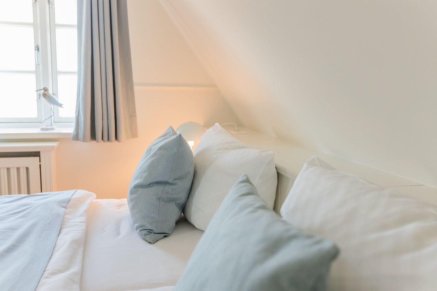 Im Obergeschoss sind zwei weitere Schlafzimmer und das Vollbad mit Dusche und Badewanne gelegen. Die Schlafzimmer sind jeweils mit einem Doppelbett und einem Smart-TV ausgestattet.