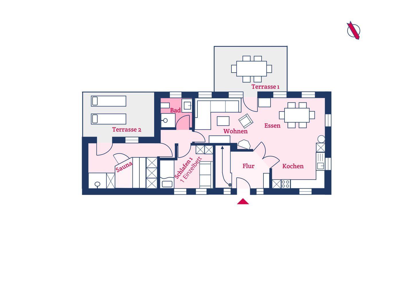 Im Erdgeschoss befinden sich der großzügige Wohn- und Essbereich mit offener Küche, ein Schlafzimmer mit Einzelbett, ein Duschbad sowie der Wellnessraum mit der hauseigenen Sauna und separater Dusche. Über den Wohnbereich und den Wellnessraum gelangen Sie direkt auf die eigene Terrasse und in den Garten. Der Kaminofen im Wohnbereich sorgt auch an kühleren Tagen für eine angenehme Atmosphäre.