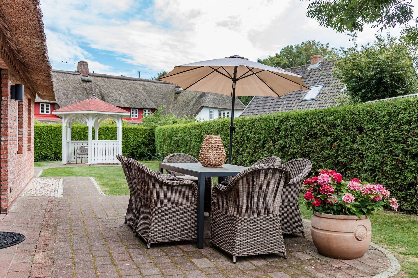 Reetdachhaus mit eigener Sauna und Kaminofen sowie großem Garten mit Terrasse, Strandkorb und Pavillon.