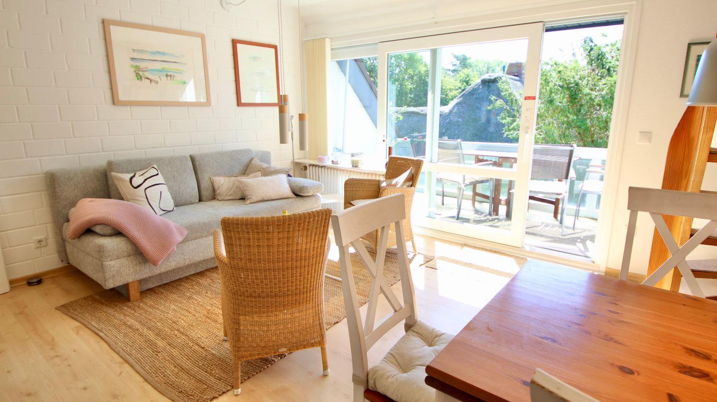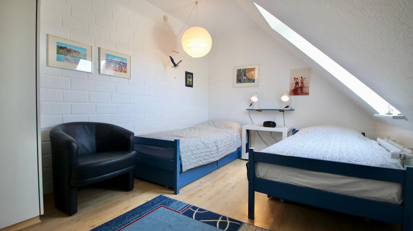 Helle 3-Zimmer-Ferienwohnung im Obergeschoss mit sonnigem Balkon. Die individuelle Wohnung verfügt über einen gemütlichen Wohn- Essbereich mit Zugang zur kleinen, aber gut ausgestatteten Küche. Der Balkon, der mit einer großen Markise versehen ist, erreichen Sie über den Wohn-Essbereich. Auf dieser Ebene befindet sich das Schlafzimmer mit zwei einzelnen Betten. Direkt daneben liegt das erste von zwei Duschbädern. Auf der 2. Ebene gibt es ein zusätzliches Schlafzimmer mit Doppelbett und bad-en-suite. Hervorzuheben ist der ausreichende Stauraum in beiden Schlafzimmern, der durch die Einbauschränke gegeben wird. Den Sandstrand in Nieblum erreichen Sie in wenigen Gehminuten.