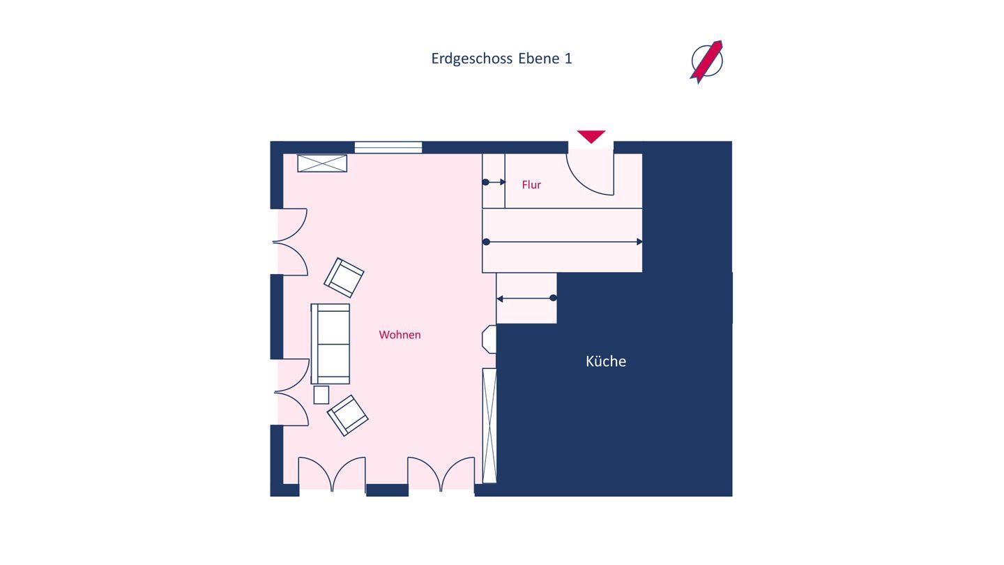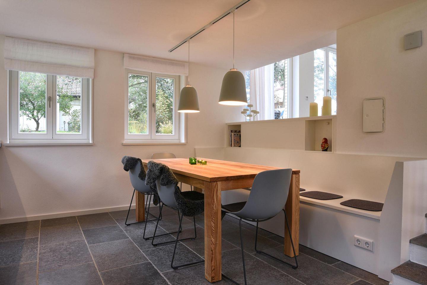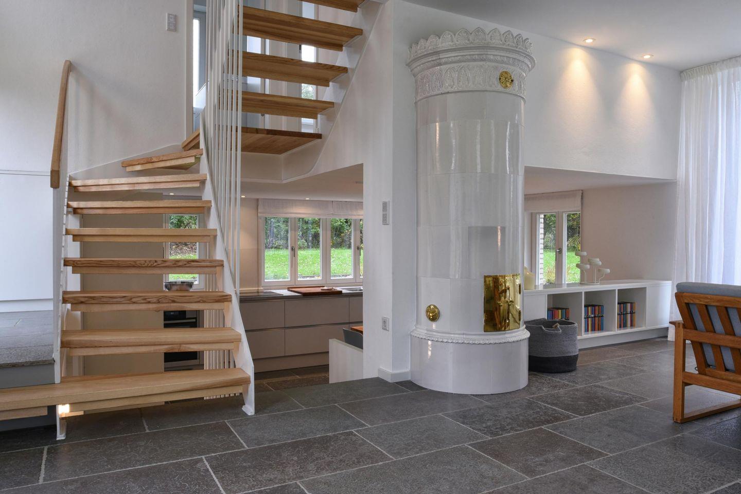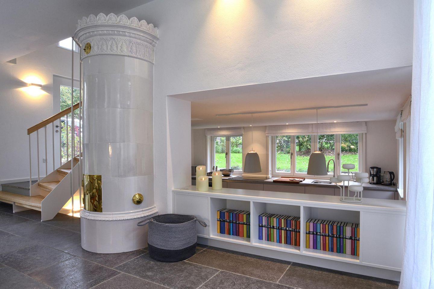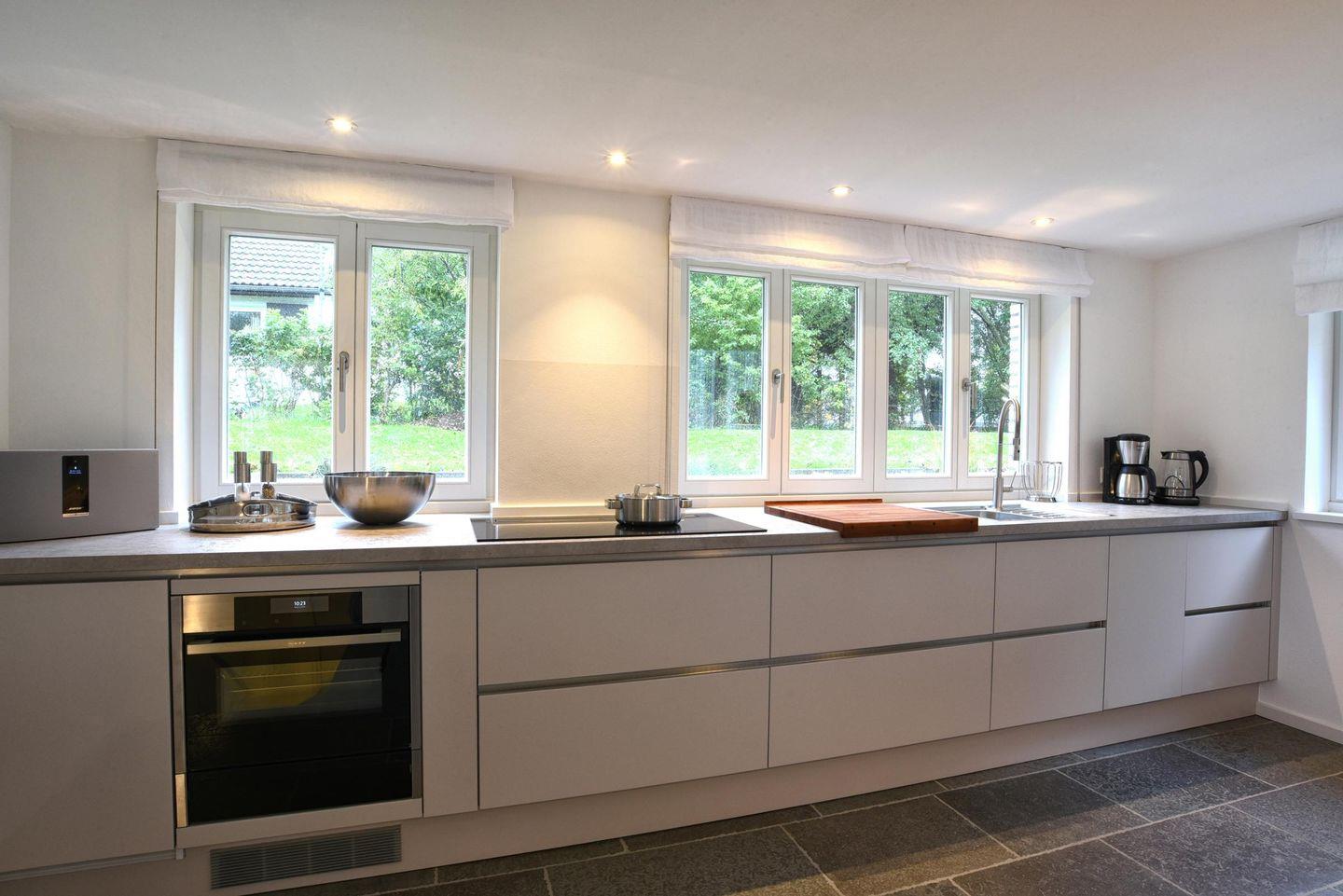Einige Stufen unterhalb der Wohnebene gelegen befindet sich die offene Küche, welche aufgrund der fein abgestimmten Ausrichtung der Erdgeschoss-Fenster ganztägig vom Tageslicht erhellt wird. Die Küche ist großzügig und modern ausgestattet und lässt kaum einen Wunsch offen.