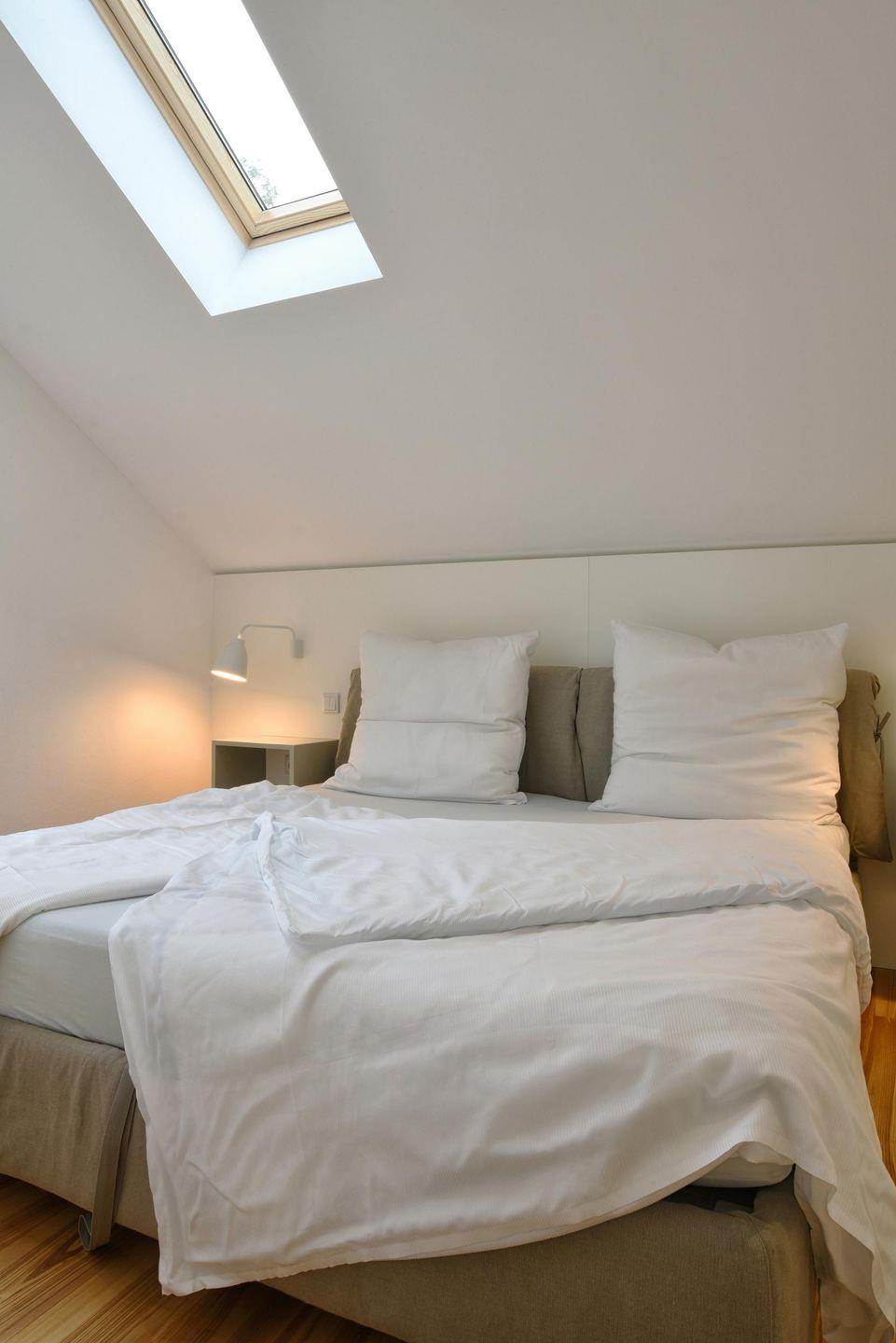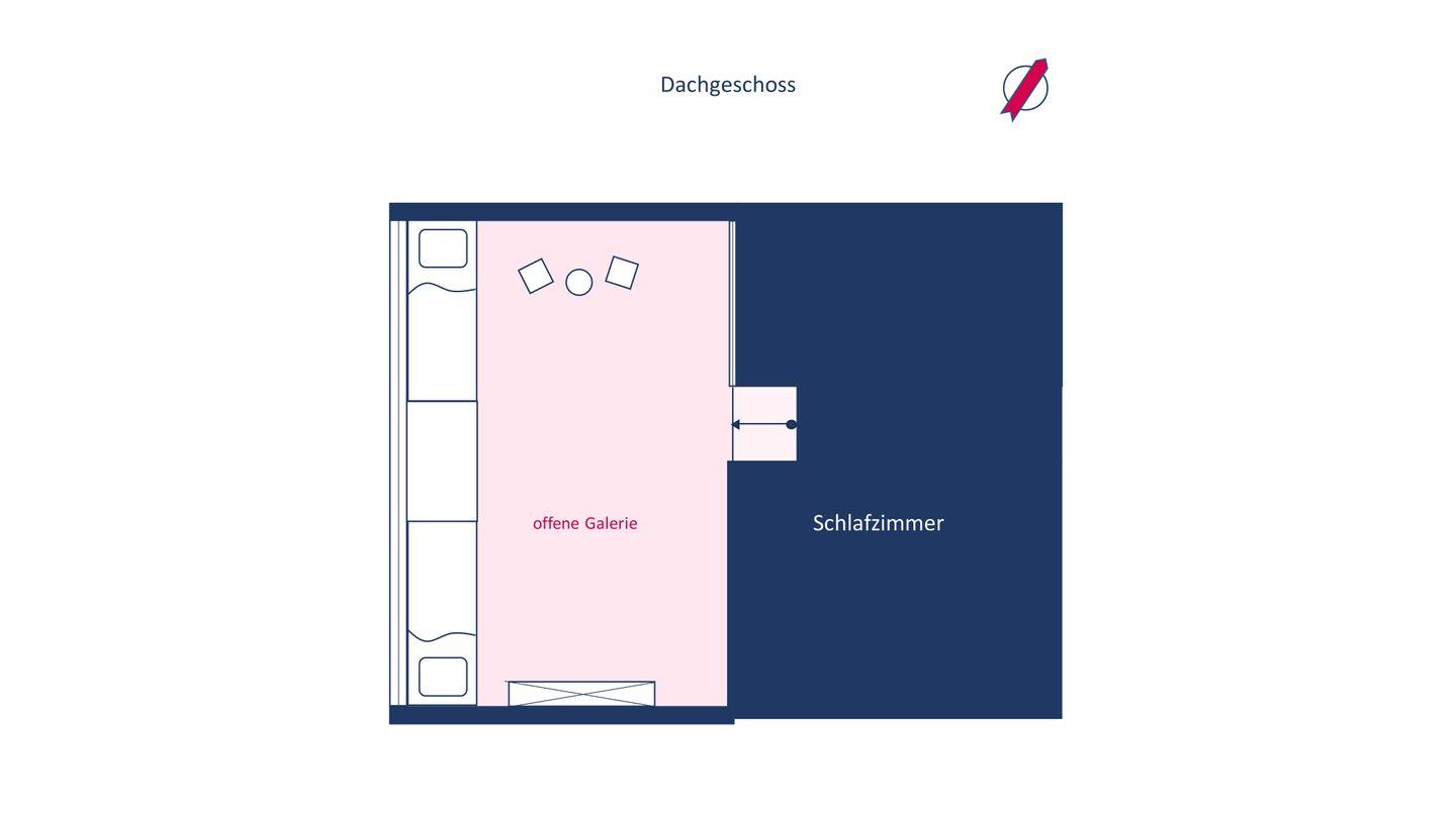 Einige Stufen oberhalb des Wohnbereiches befindet sich eine Ebene mit zwei Zimmern. Hier liegt das Schlafzimmer mit Doppelbett sowie das Badezimmer mit einer bodengleichen Dusche. Wenige Stufen über dem Schlafzimmer befindet sich die offene Galerie, in der Sie unter anderem auch diverse Kinderspiele sowie den Fernseher vorfinden.