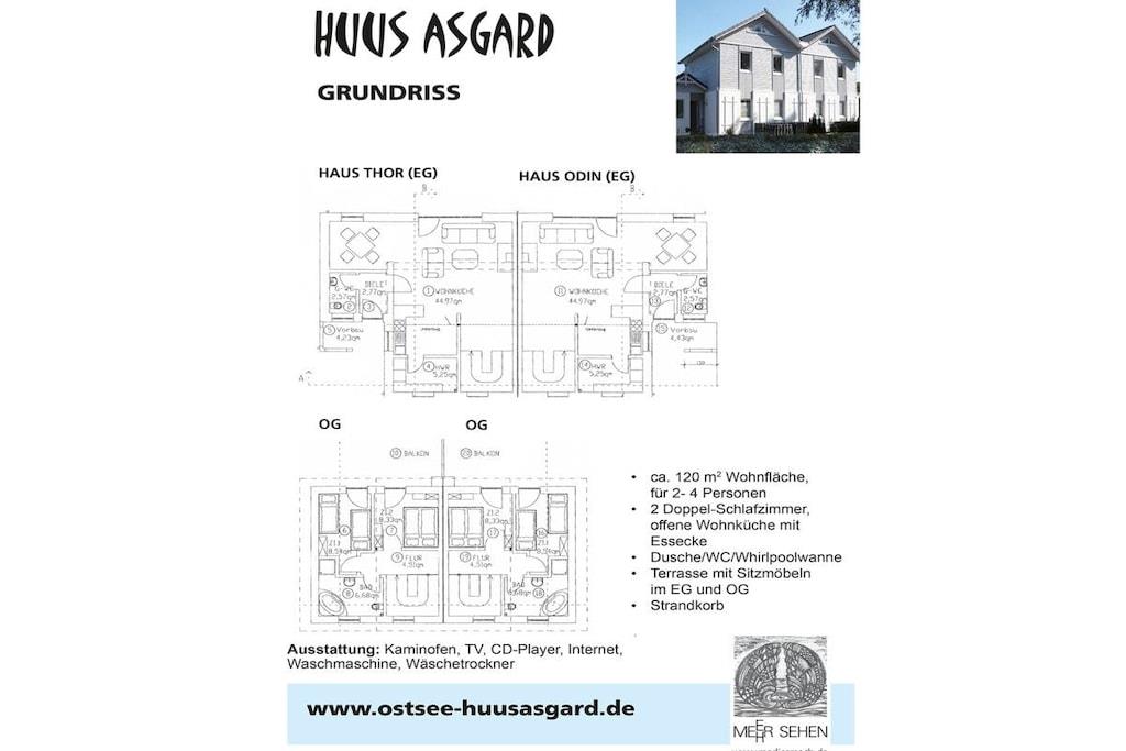 Ferienhaus Haus Odin von Huus Asgard ist identisch mit Ferienhaus Haus Thor: Ein perfekt eingerichtetes Ferienhaus mit Garten inkl. Sitzgelegenheiten, Boulebahn, Außenschach, Freiland-Mühlespielfeld, Badminton-Spielfläche…und nur 150 m vom Natur-Badestrand. Die Sauna ist im Nebengebäude untergebracht und steht den Gästen von Huus Asgard gegen Gebühr und nach Absprache zur Verfügung. PKW-Parkplätze auf dem Grundstück, E-Bike-Ladestation steht zur Verfügung. Haus Odin bietet ausreichend Platz für bis zu 4 Personen, verfügt über eine große Terrasse im EG + OG mit Gartenmöbeln und einem Starndkorb, Whirlpoolbadewanne, Kaminofen, CD-Anlage. Sat-TV, separater Schreibtisch, WLAN-Ausstattung, eine voll ausgestattete offene Küche. IM OG befinden sich 2 Schlafzimmer (1x Doppelbett, 1 x 2 Einzelbetten), Gäste-WC. PKW-Parkplätze auf dem Grundstück, E-Bike-Ladestation steht zur Verfügung.