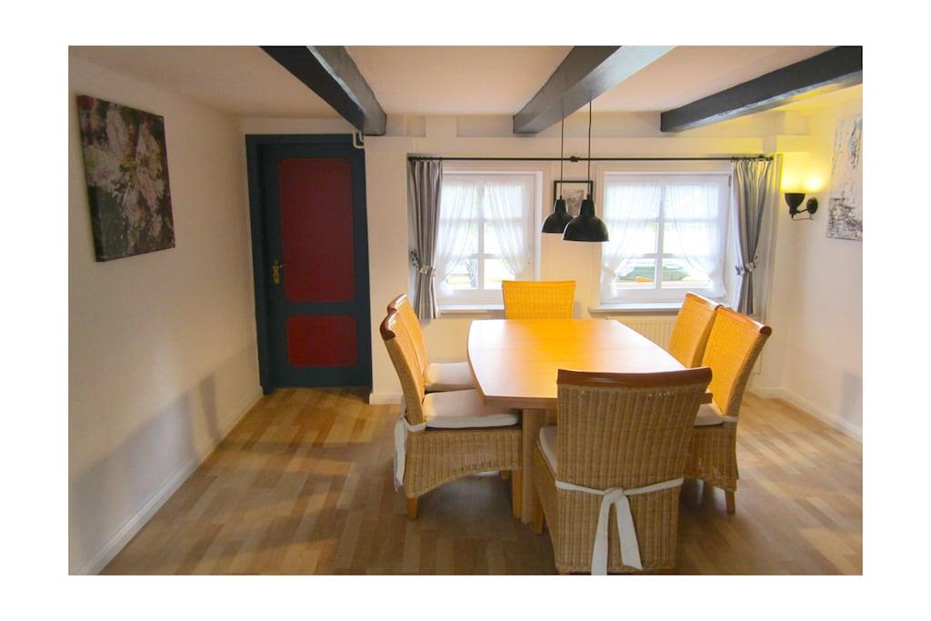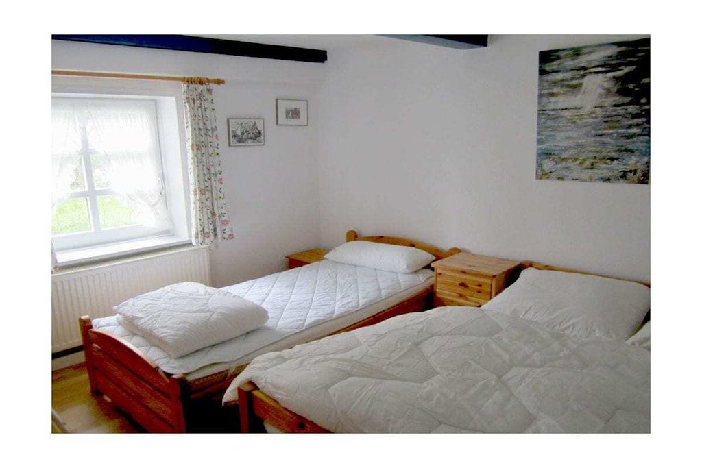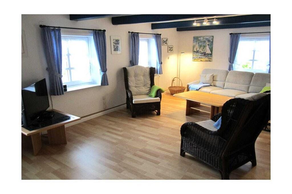 Cozy holiday apartment with sauna on the ground floor of a typical thatched-roof cottage directly on the Baltic Sea. Large garden with seating furniture and beach chair.