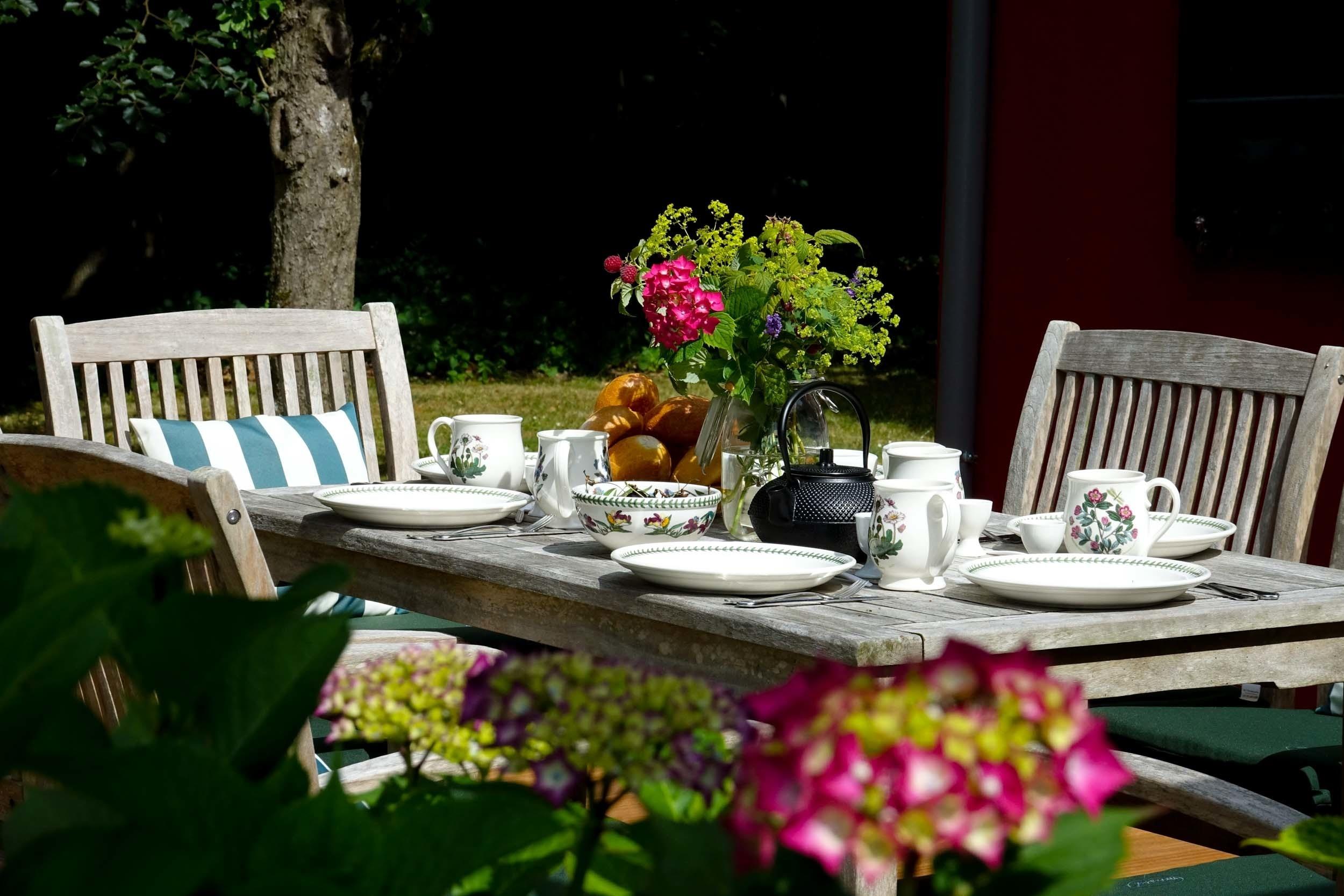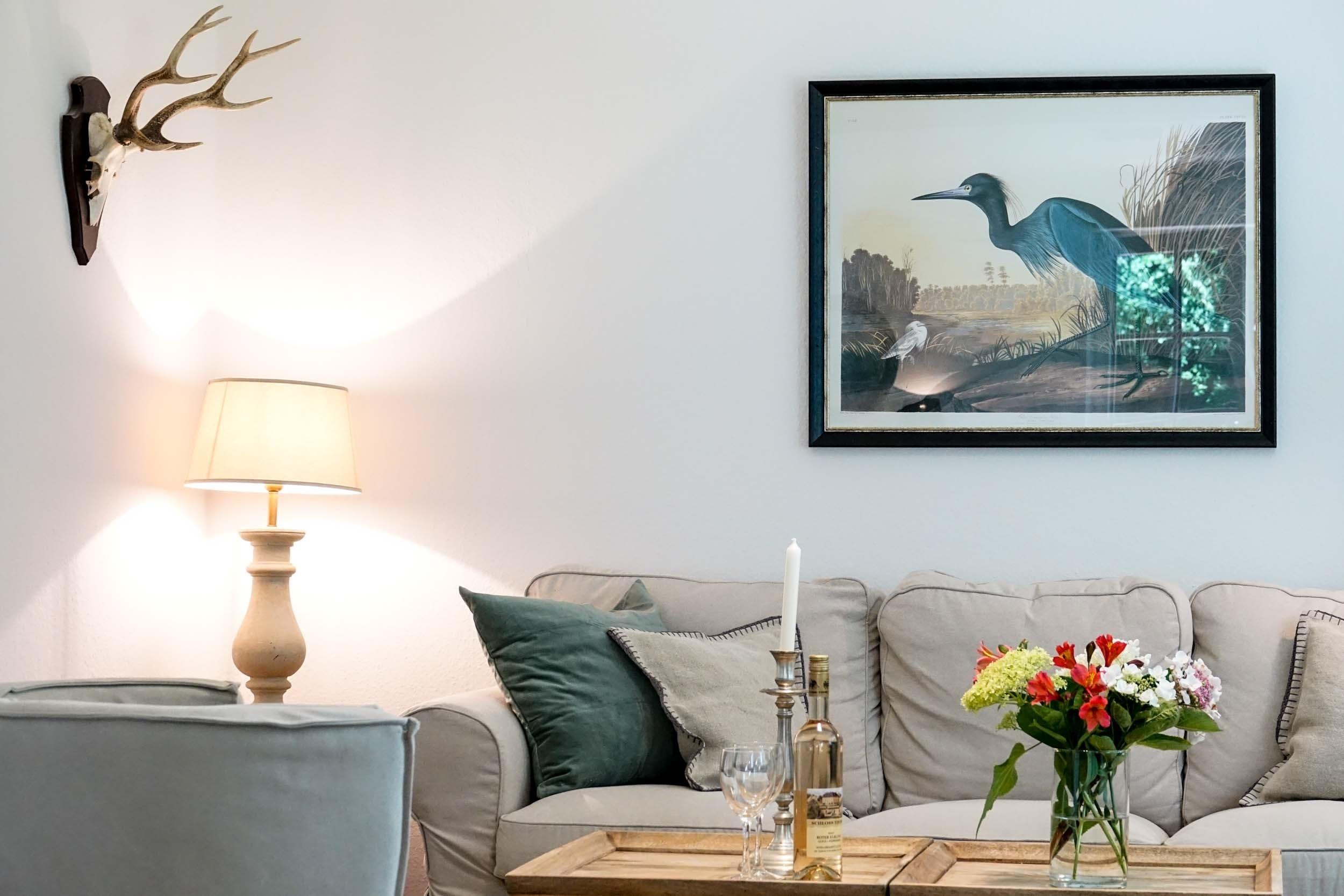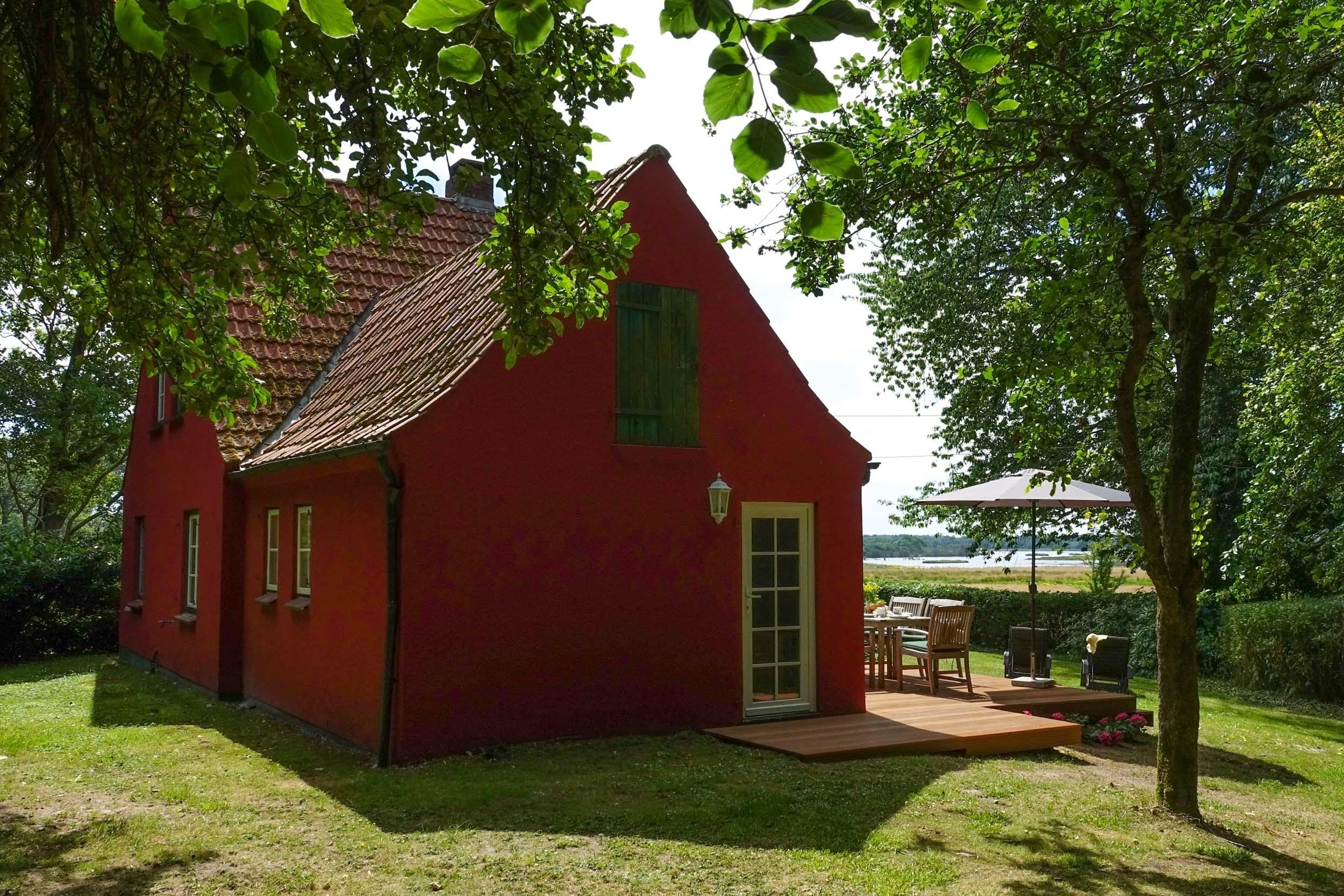 Als der Gutshof auf Beveroe mit seiner großen Walfischscheune noch auf der Geltinger Birk stand, wurde dieses Haus von einem ehemaligen geflohenem Gutsbesitzer, ganz in der Nähe erbaut. Die Försterei liegt am Waldrand, mitten im Landschaftsschutzgebiet in einer absoluten Alleinlage. Ochsenblutrot gestrichen ist es schon von der Mühle Charlotte in der Ferne liegend sichtbar und ebenso weit ist der Blick von der Terrasse und dem Garten, der heute über die Weiden der Wildpferde und Highland Rinder schweift, die zur Landschaftspflege des Gebiets eingesetzt werden.