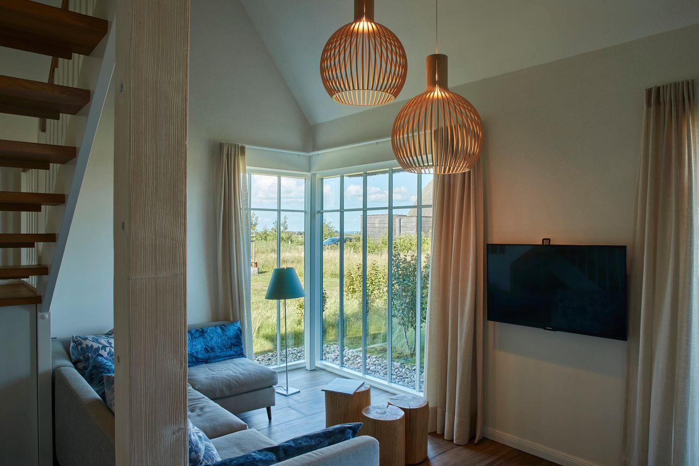 Auf 110 Quadratmetern Wohnfläche genießen Sie die Annehmlichkeiten der exklusiven Einrichtung in Ihrer Künstlerkate Nehrung im Reetdorf Geltinger Birk. Kamin, Sauna und eine großzügige Terrasse mit Teakholzsitzecke und eigenem Strandkorb sind nur einige Aspekte der Wohlfühl-Oasen in diesem 5-Sterne-Ferienhaus. Es verfügt über zwei Doppel - und einem Einzelzimmer mit zwei Bädern, eines davon en-suite. Der untere Schlafbereich und das Bad im Erdgeschoss sind frei von Schwellen und Hindernissen.