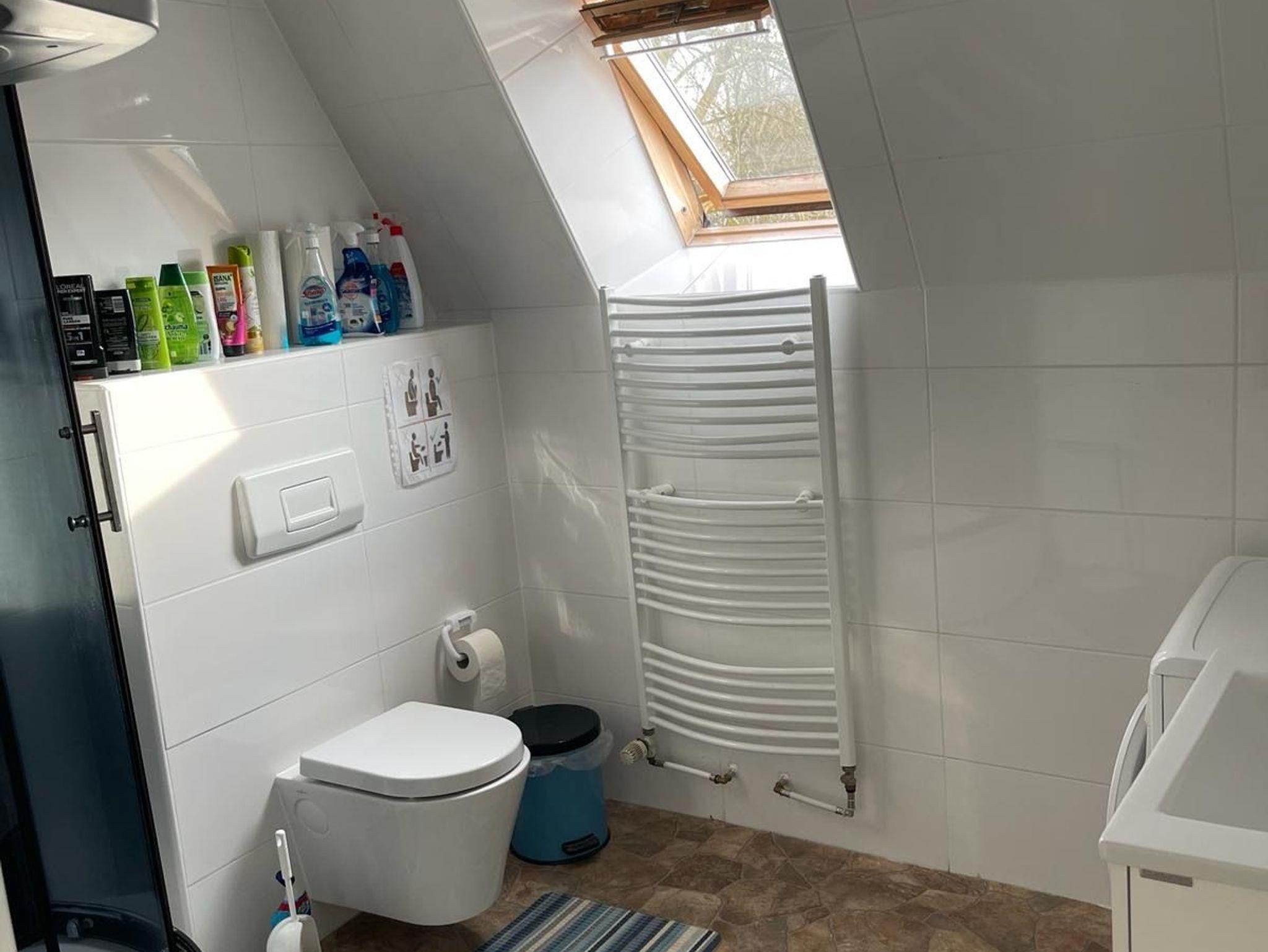 Das gemeinschaftliche Badezimmer verfügt außerdem über eine Waschmaschine.