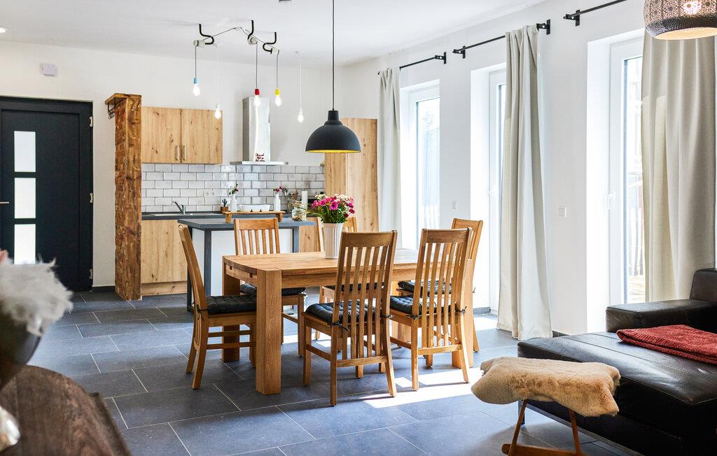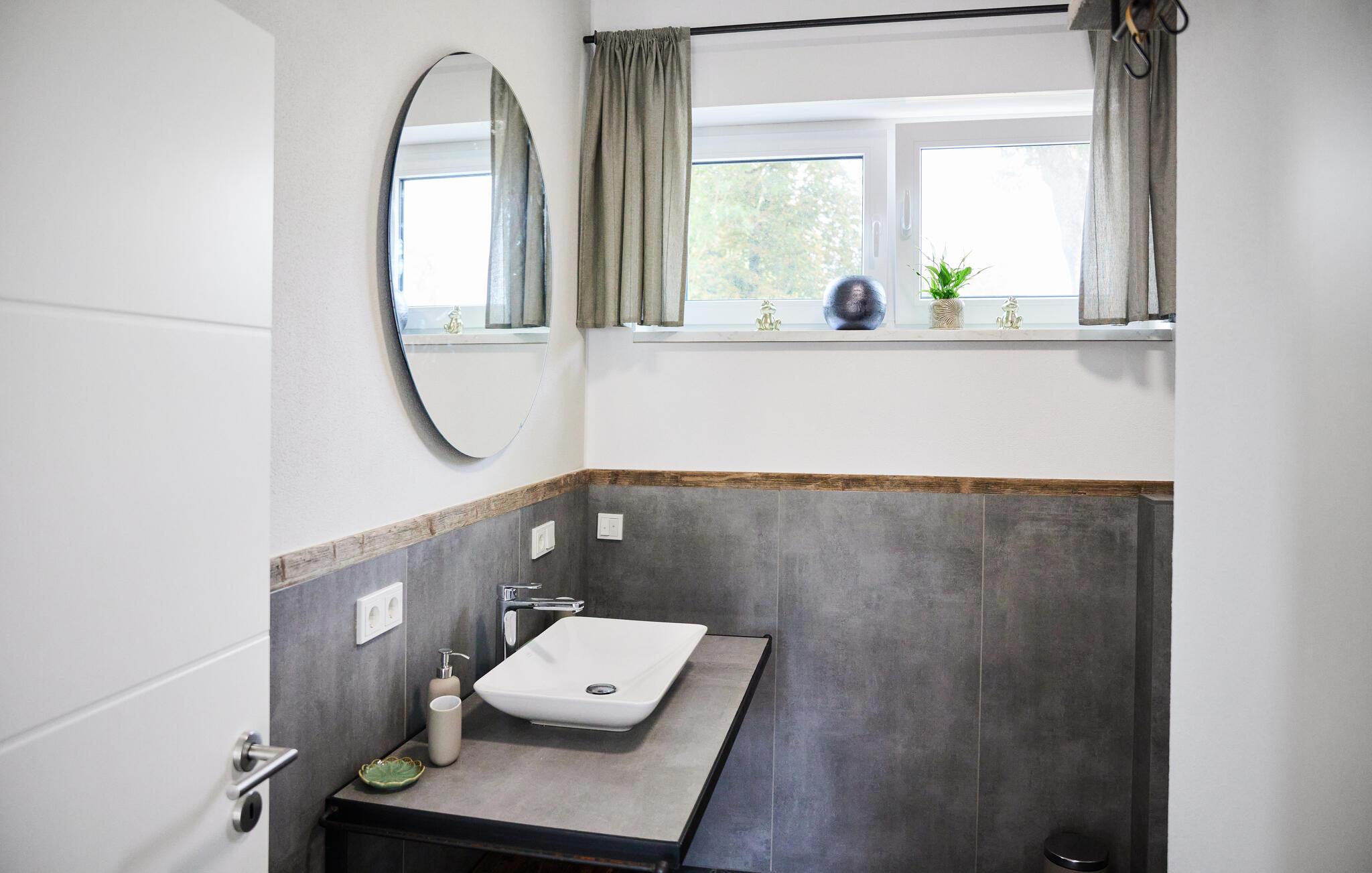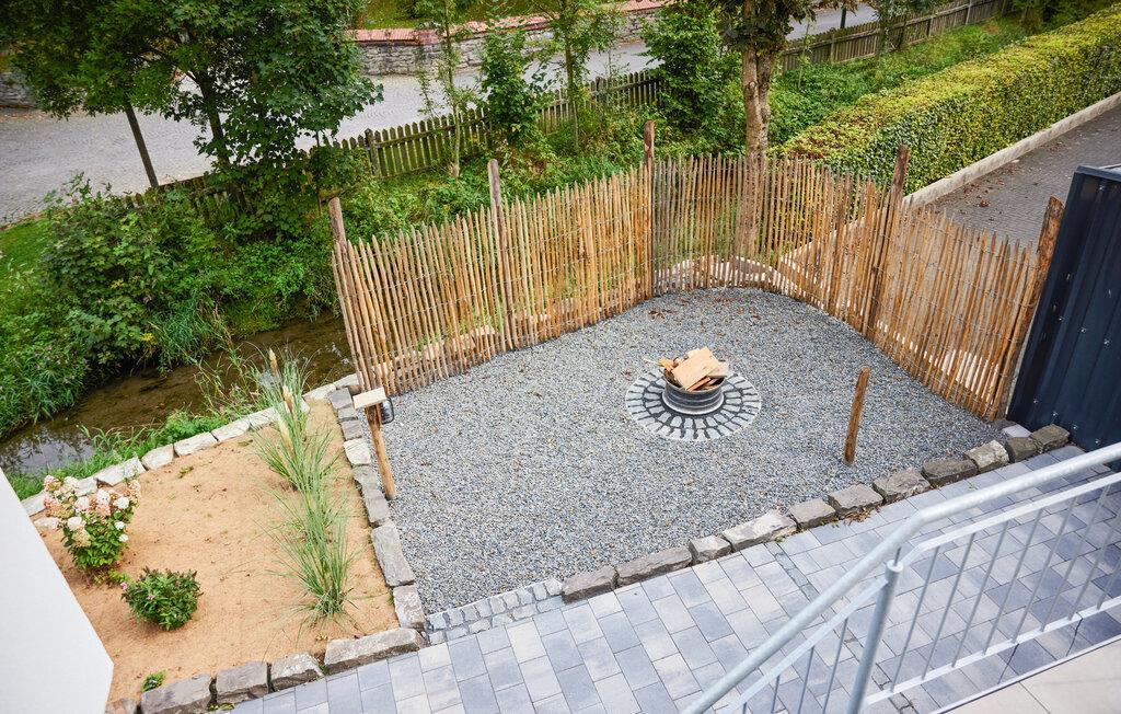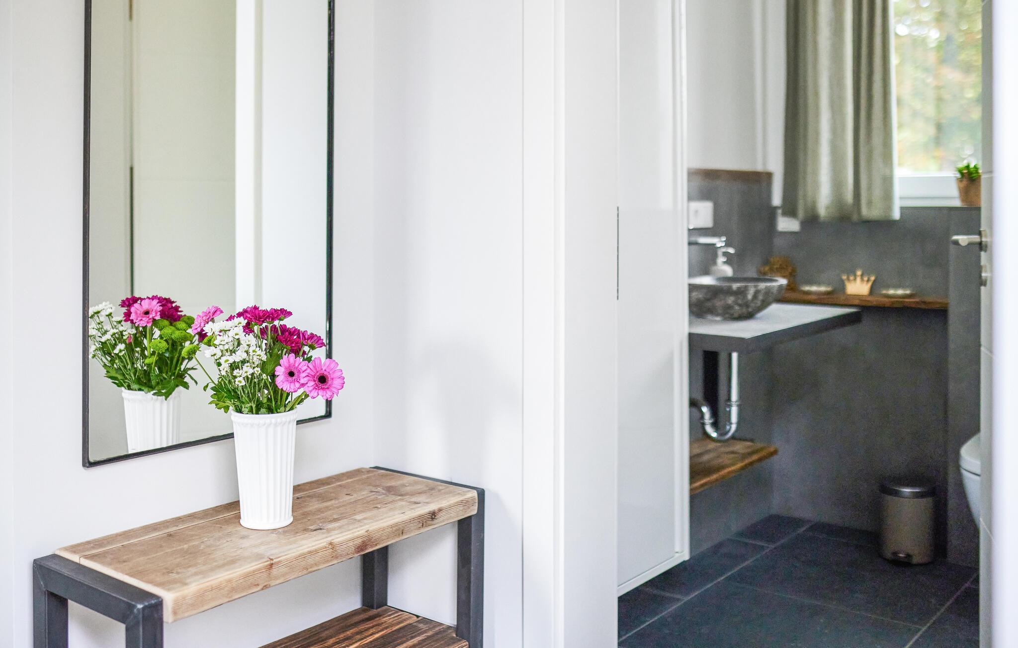 Oplev ren afslapning i denne moderne og stilfulde ferielejlighed. Den smarte kombination af mørke fliser og kvalitetsløsninger i træ skaber en harmonisk atmosfære, der lægger op til at nyde livet og have det rart. De lyse rum på første sal giver jer masser af muligheder for at slappe af. Nyd den åbne terrasse med en vidunderlig udsigt over landskabet. Adgangen til åen og et bålfad i haven lægger op til en masse gode oplevelser udendørs.