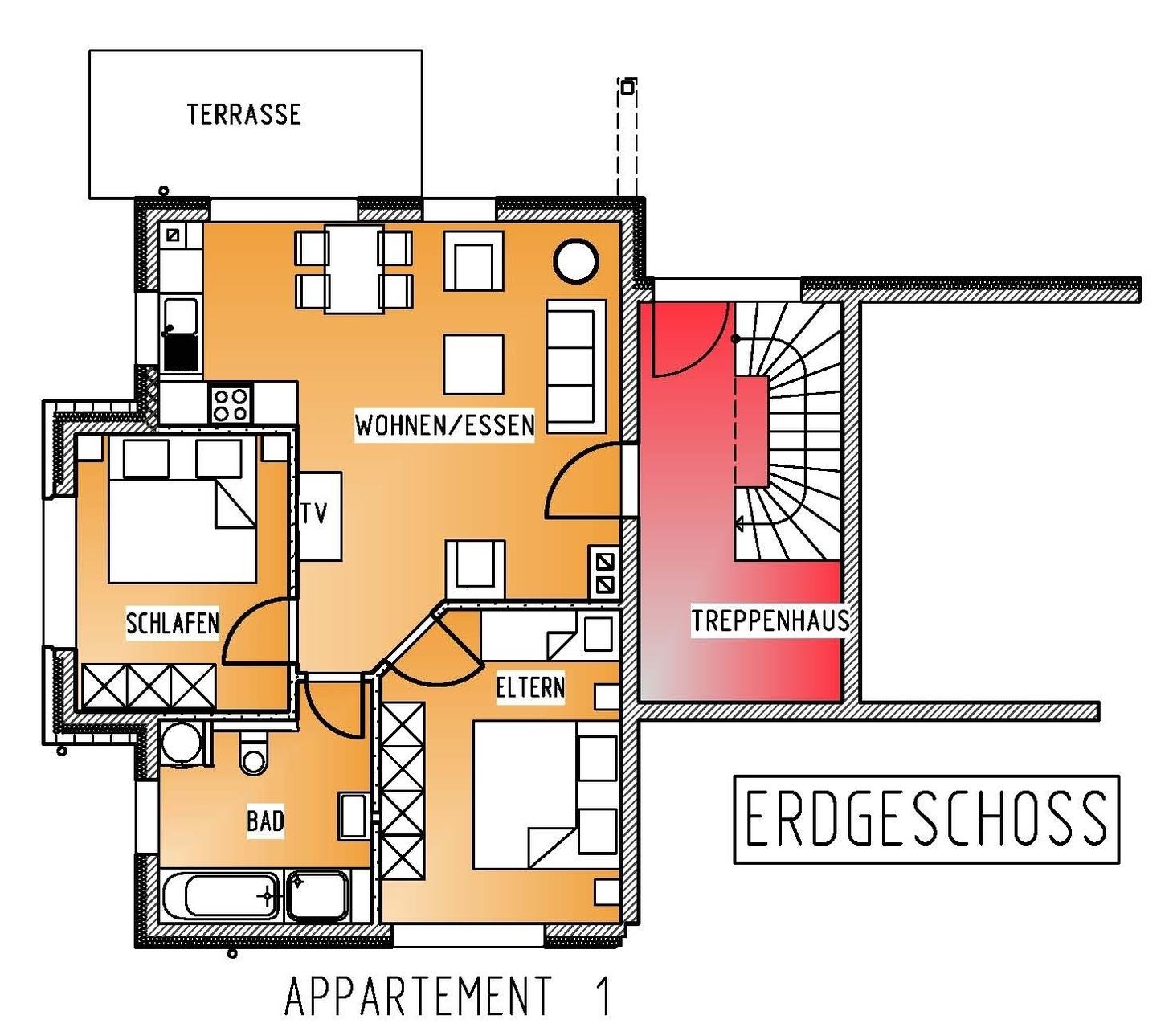 Ihre Ferienwohnung bietet alles, was Sie für einen komfortablen Aufenthalt brauchen: eine sonnige Süd-Terrasse mit Gartenblick, ein gemütlicher Wohnbereich mit Sat-TV, sowie eine voll ausgestattete Küche mit Kühlschrank, Geschirrspüler, Ofen, Kaffeemaschine und Wasserkocher.