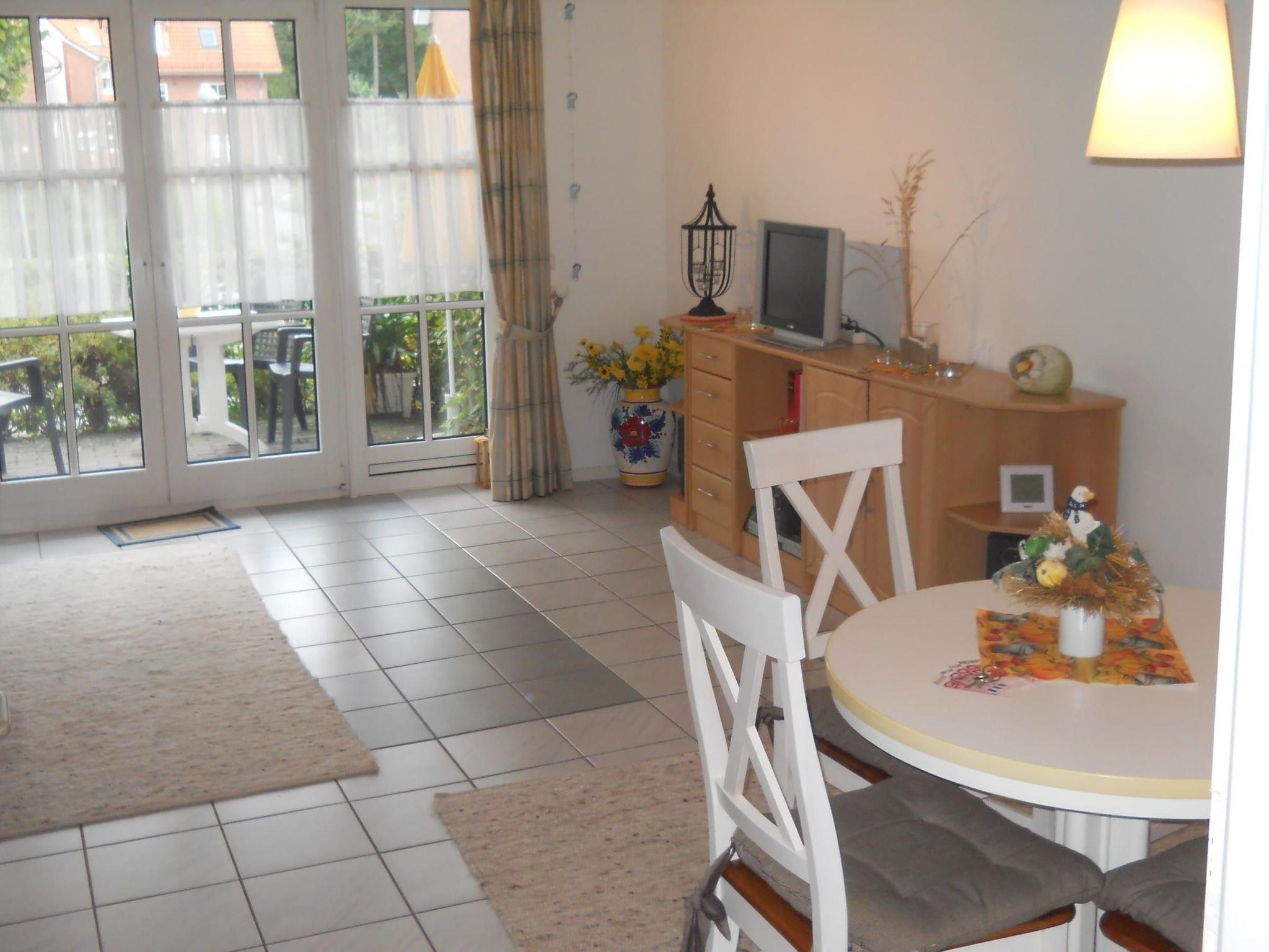Spacious living room with integrated kitchen, dining area and direct access to the east-facing terrace, as well as a sofa bed. Bedroom with double bed with 100 x 200 cm single mattresses and bedside tables. Outside window with blackout blind, large wardrobe and large dressing mirror. A travel cot fits to the right of the double bed, which we can provide free of charge on request. Please bring your own bed linen. The kitchen is integrated into the living room and is equipped with everything you are used to at home, including - fridge with freezer compartment - cooker with ceramic hob and oven - microwave - kettle - coffee machine - coffee pod machine - dishwasher Bathroom with shower, washbasin, WC and bathroom cabinet.