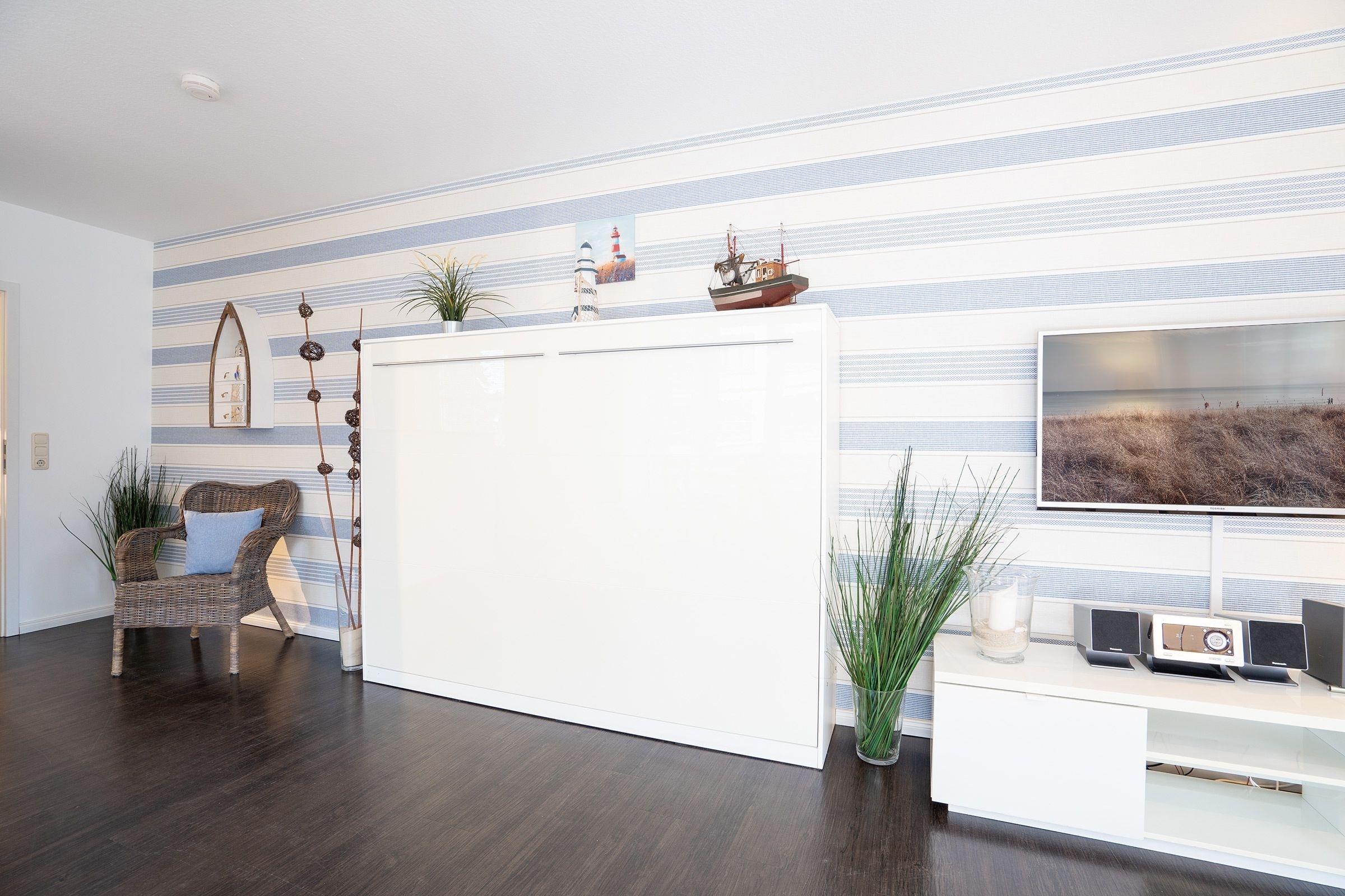 Wohnzimmer: 1 Schrankbett (140x200 cm), Verdunkelung (Plissees und teilweise Verdunkelungsvorhänge)