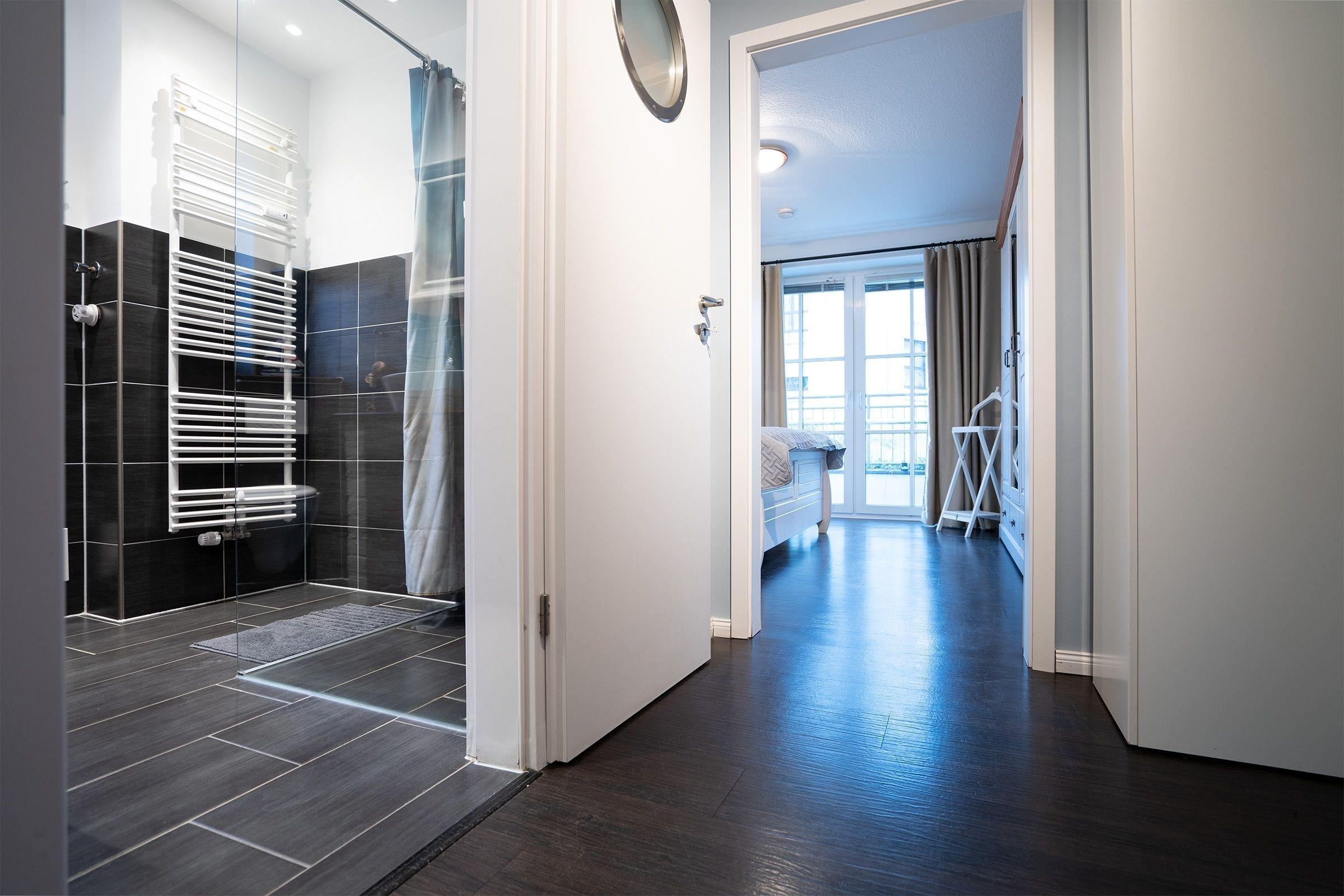 Der Wohnbereich ist modern und maritim eingerichtet und begrüßt Sie mit einem Sofa, einem Flachbildfernseher sowie Zugang zur überdachten, möblierten Terrasse. Als Schlafmöglichkeit für 2 Personen ist ein Schrankbett (140x200 cm) vorhanden. Die Küche grenzt offen an den Wohnbereich und ist voll ausgestattet - Annehmlichkeiten wie z. B. ein Herd, ein Backofen sowie ein Geschirrspüler stehen Ihnen zur Verfügung. Für den täglichen Kaffeegenuss sorgt eine Nespresso-Kapselmaschine. Im separaten Schlafzimmer erwartet Sie ein komfortables Doppelbett (2x 90x200 cm) und ein großer Kleiderschrank für Ihre Urlaubsgarderobe. Das moderne Tageslichtbad bietet Ihnen neben einem WC auch eine bodengleiche Dusche und einen beheizbaren Handtuchhalter.