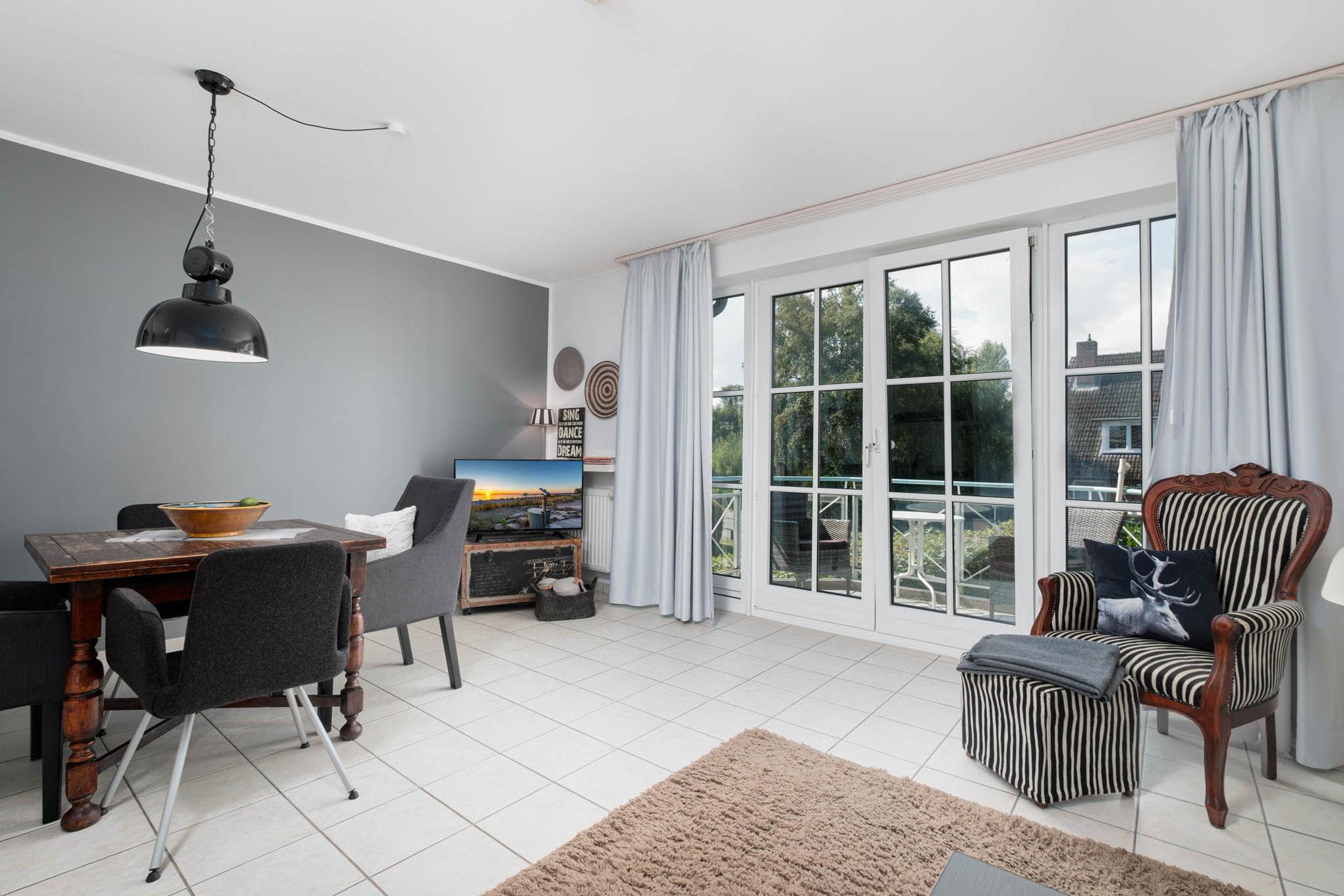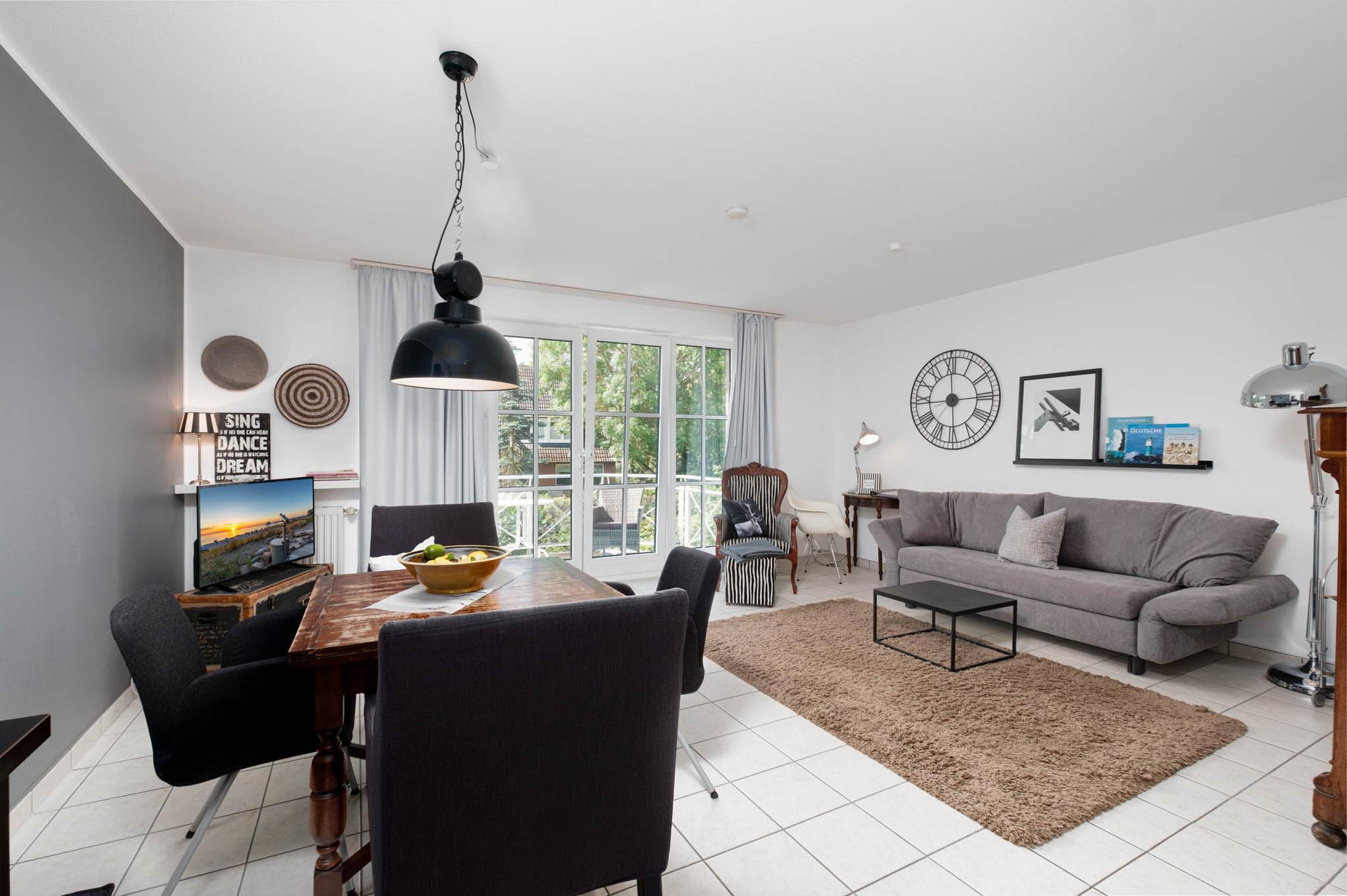 Die in 2019 komplett renovierte Niendorf Ferienwohnung Nr. 7 befindet sich im 1. OG der Ostseeallee 2. Es erwartet Sie ein modernes 2-Zimmer Appartement, dass für bis zu vier Personen eingerichtet ist. Das Wohnzimmer ist mit einer hochwertigen Schlafcouch (160 cm x 200 cm), Flatscreen-Smart-TV, einer gemütlichen Essecke sowie einer angrenzenden offenen Einbauküche mit Ceranfeld, Backofen, Mikrowelle und Geschirrspüler ausgestattet.