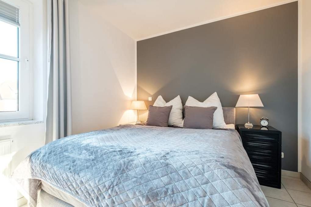 Das separate Schlafzimmer verfügt über ein Boxspringbett (160 cm x 200 cm - durchgehender Topper) und einem 2. Flatcreen-TV. Zum Appartement gehört ein modernes Duschbad sowie ein möblierter Balkon in Süd-West-Lage. Hier können Sie die Sonne und Ihren Urlaub in vollen Zügen genießen. Ein Internetanschluss / WLAN ist für alle Urlaubsgäste des Ferienobjektes kostenlos nutzbar.