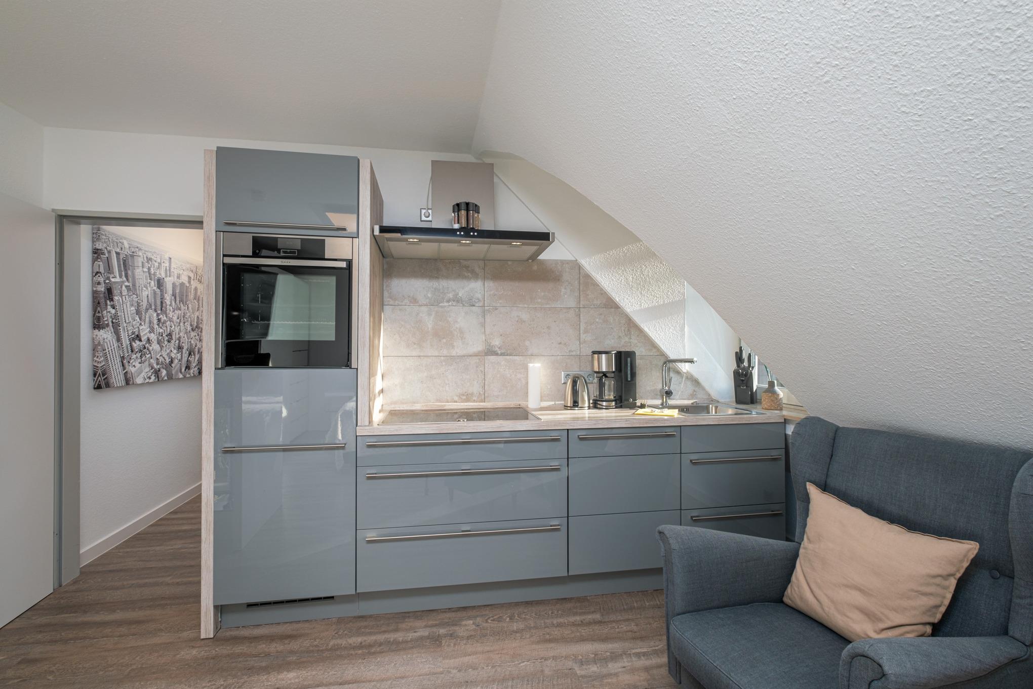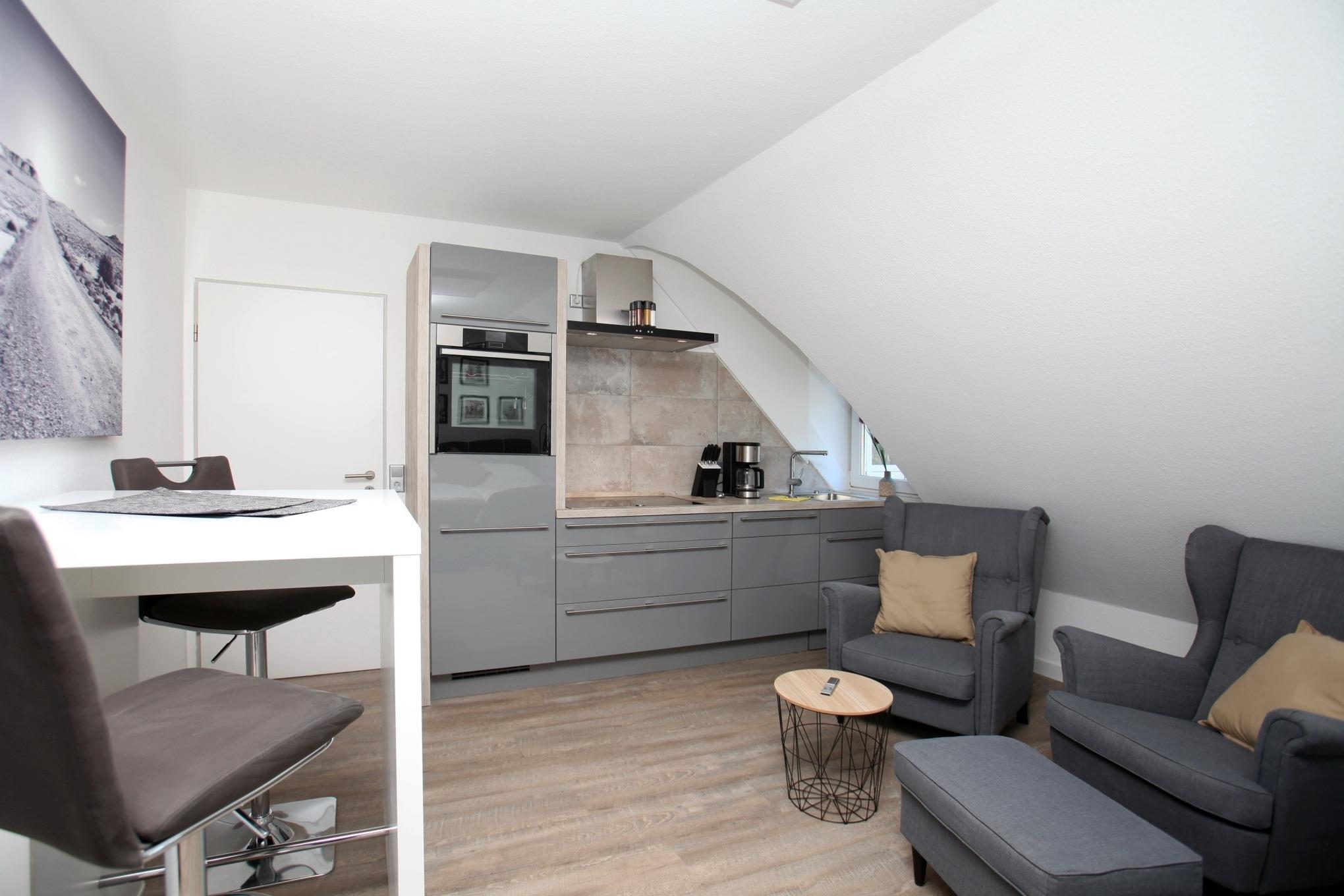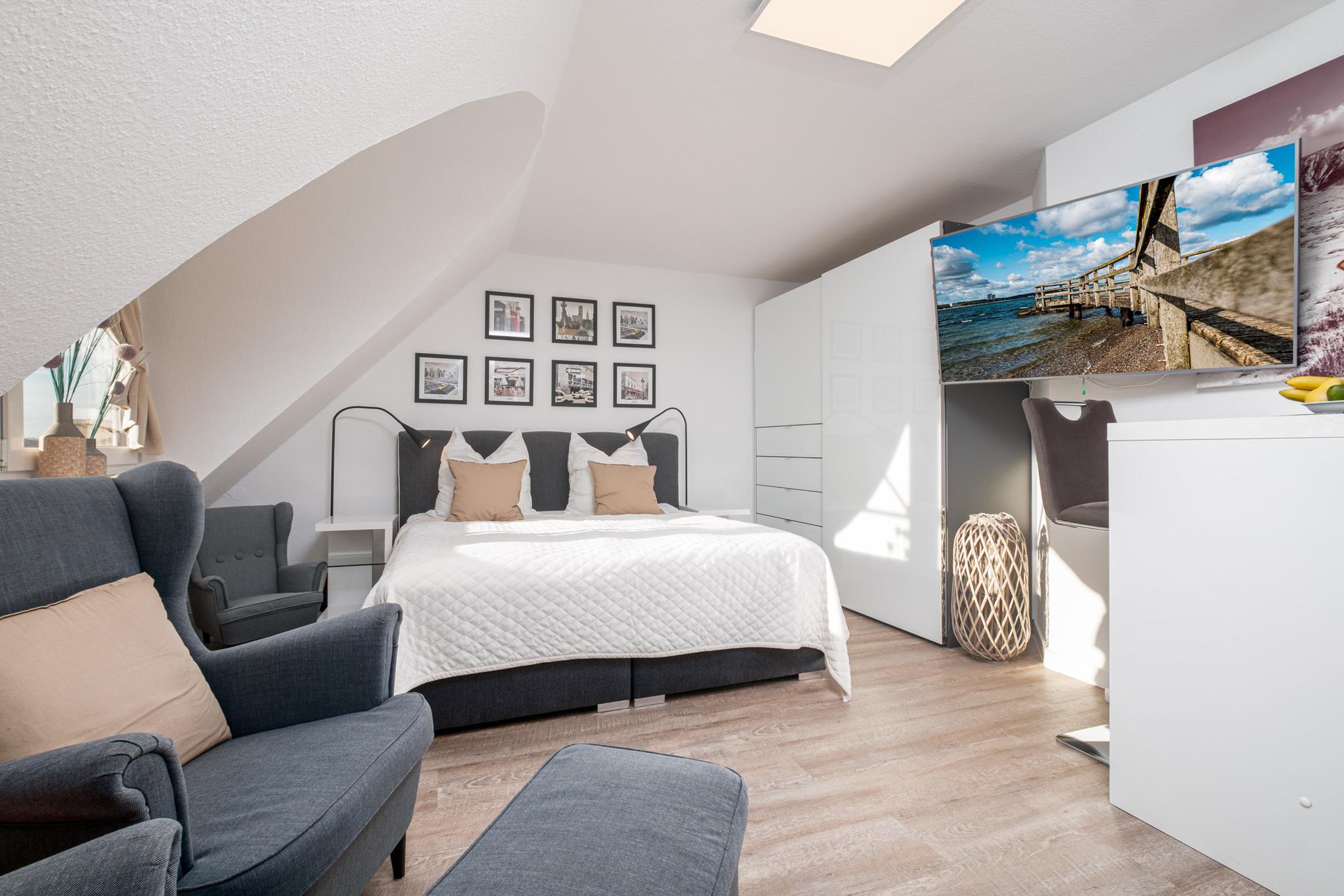Im Wohnschlafraum ist ein bequemes Doppelboxspringbett sowie eine Essecke und eine integrierte, voll ausgestattete Einbauküche mit Geschirrspüler und Backofen vorhanden.