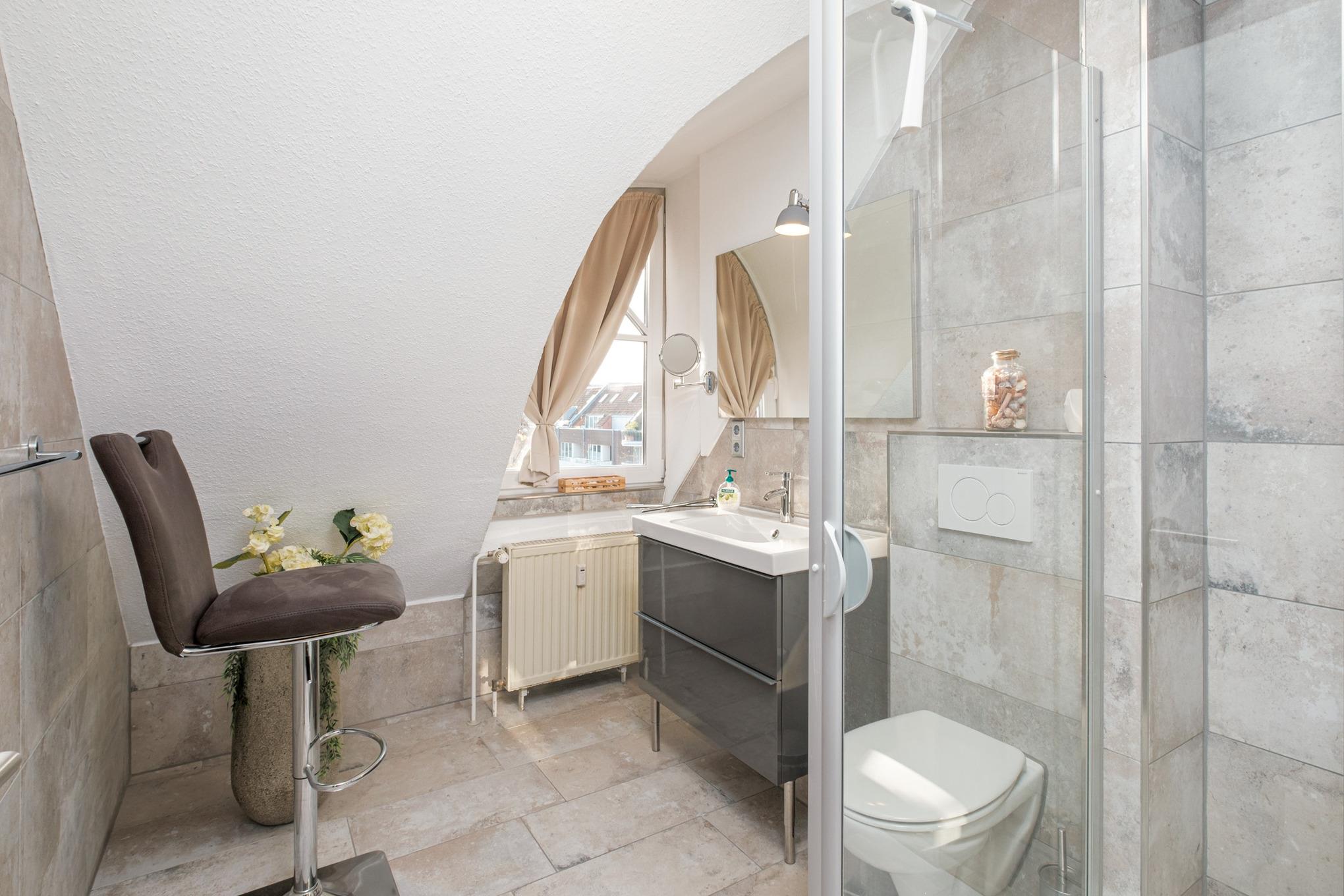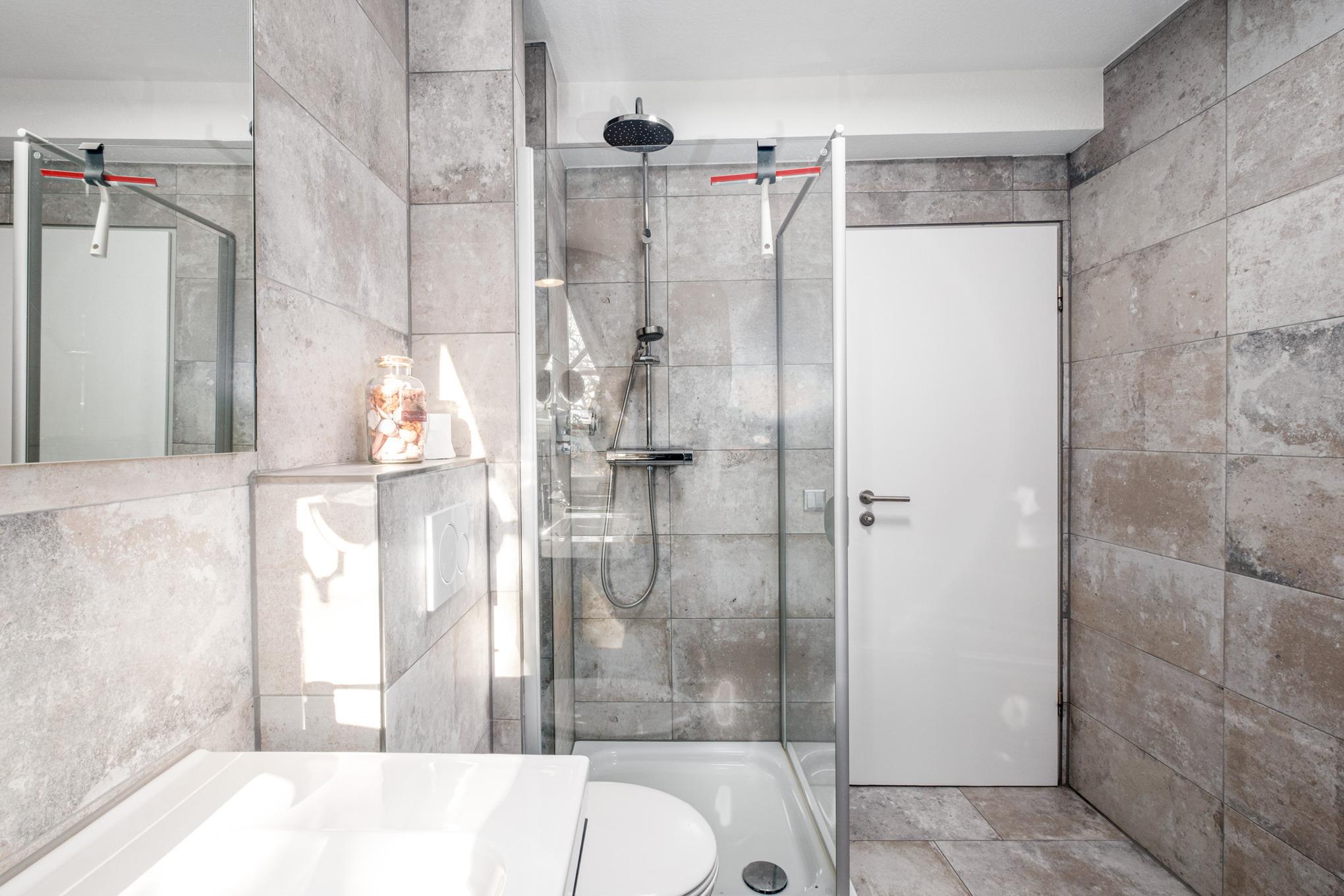 Das moderne Badezimmer verfügt über eine Dusche, WC und einen Fön.