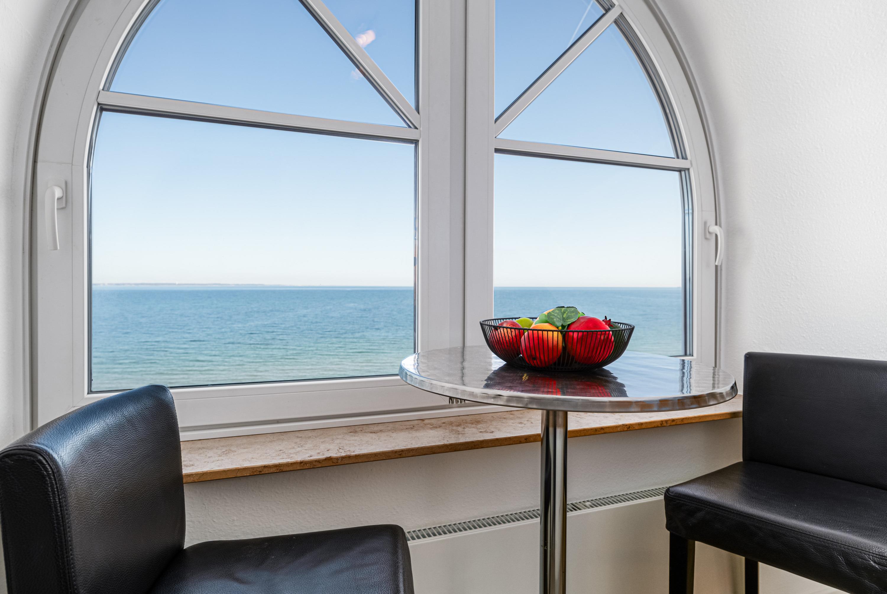 In dieser in 2025 modernisierten und 72m² großen Niendorf Ferienwohnung im 4. OG genießen bis zu 4 Personen aus fast allen Fenstern einen wunderschönen Meerblick auf die Ostsee.