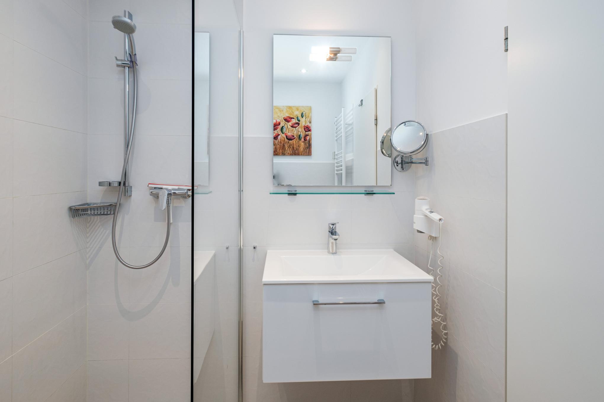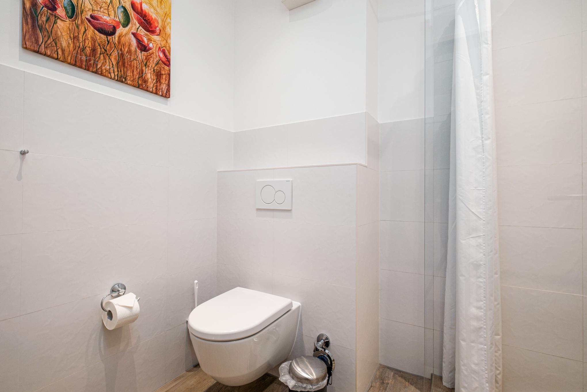 Im modernen Badezimmer mit einer Glasregendusche, WC, Fön und Handtuchwärmer erfrischen Sie sich nach einem erholsamen Tag am Strand.