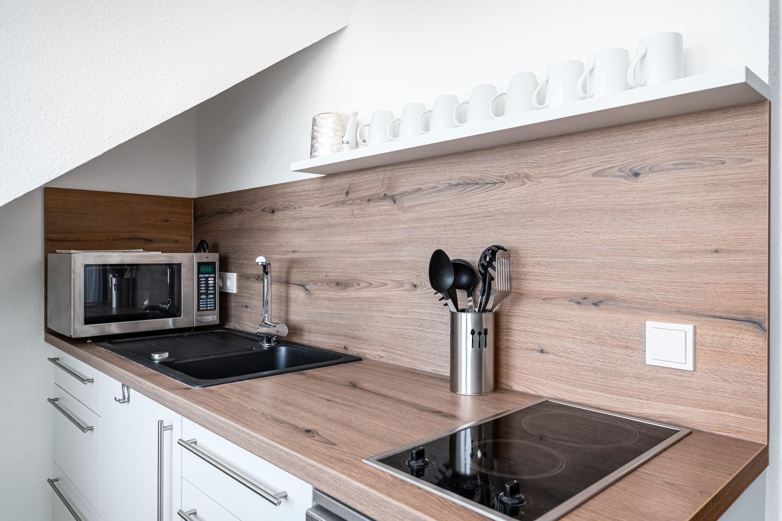 Die neue Küche ist mit Geschirrspüler, Mikrowelle und einem Stehtisch eingerichtet. Bei einer heißen Tasse Kaffee oder Kaltgetränk genießen Sie einen traumhaften Blick auf die Ostsee.