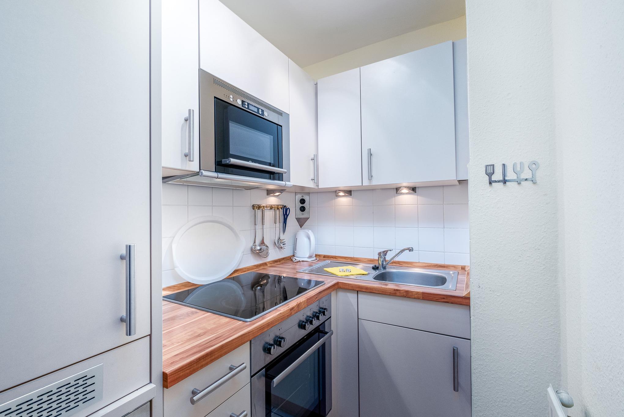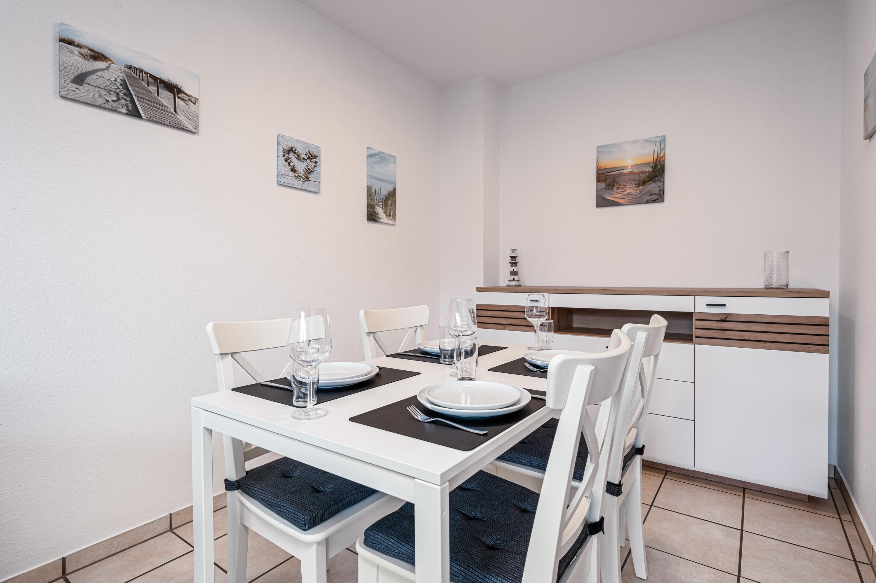 Eine gemütliche Essecke für 4 Personen sowie eine voll ausgestattete Küche mit einer Geschirrspülmaschine und einer Mikrowelle sind ebenfalls vorhanden.