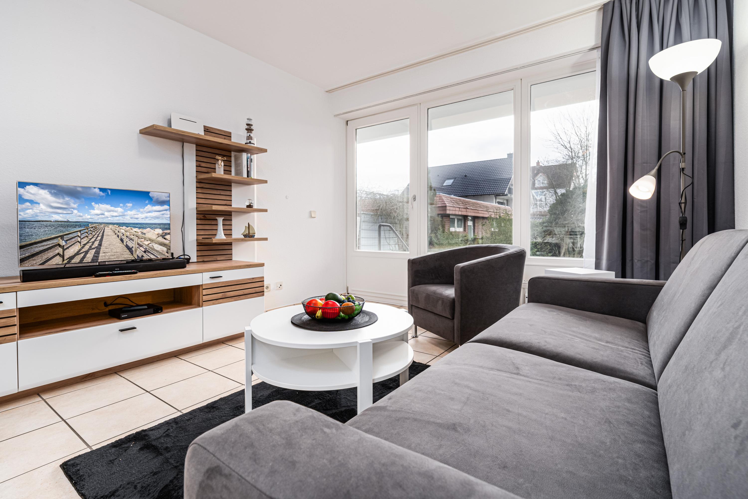 In 2024 renoviert und neu möbliert, verfügt der hell und freundlich eingerichtete Wohnraum über einen bequemen Sitzbereich mit hochwertiger Schlafcouch sowie Kabel-TV und DVD-Player.