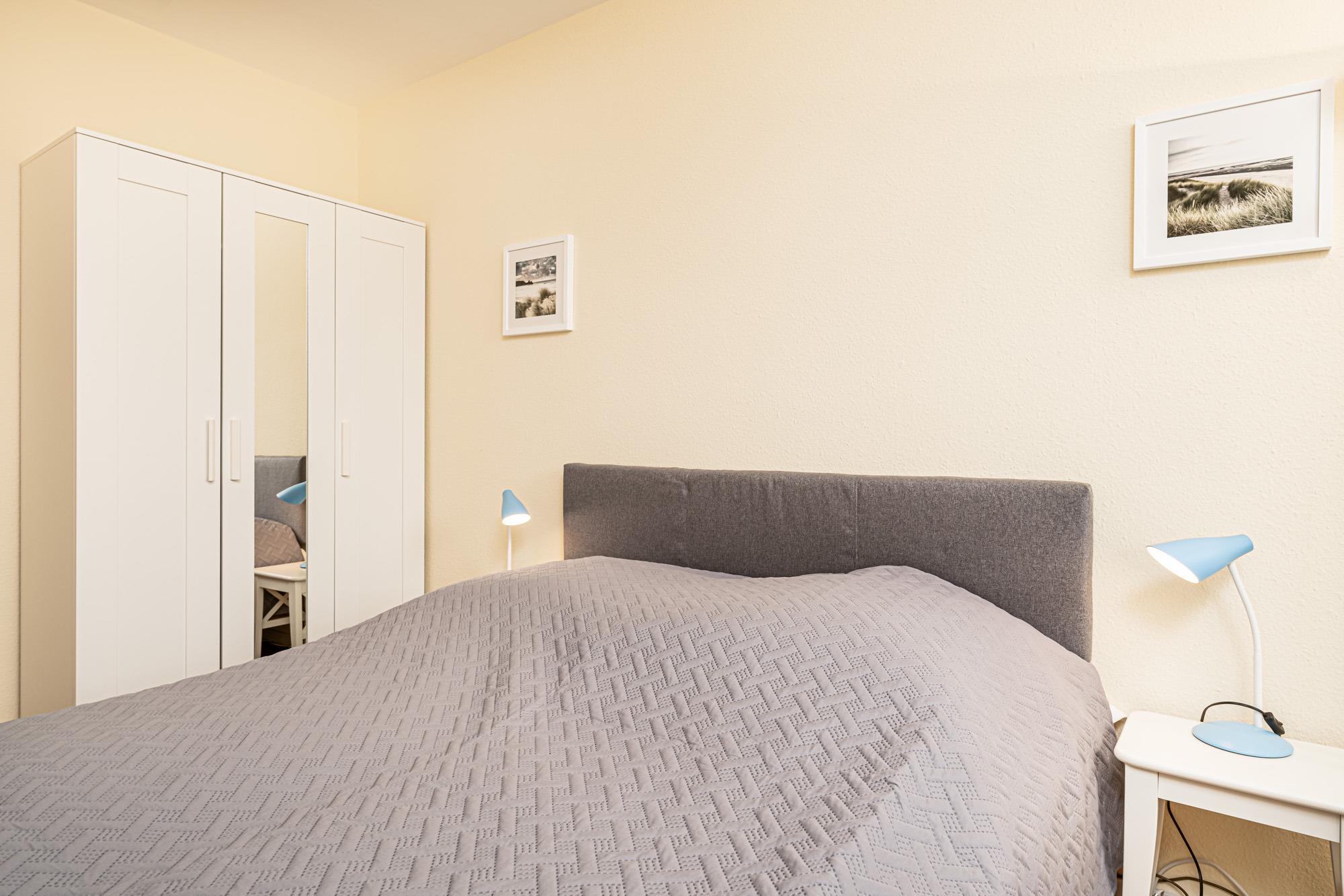 Das separate Schlafzimmer ist mit einem komfortablen Doppelbett (160 cm x 190 cm), einem zweiten TV sowie einem Kleiderschrank ausgestattet. Hier erholen Sie sich von einem ausgiebigen Strandtag.