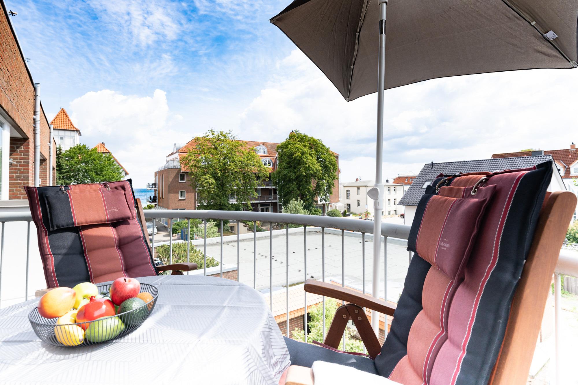 Vom Wohnzimmer aus gelangen Sie auf den großzügigen Balkon mit Ost-Ausrichtung, wo Sie morgens den Sonnenaufgang bei einer heißen Tasse Kaffee oder Tee genießen und sogar das schöne Blau der Ostsee erblicken können.
